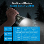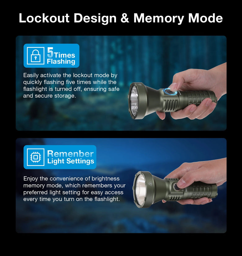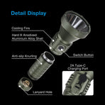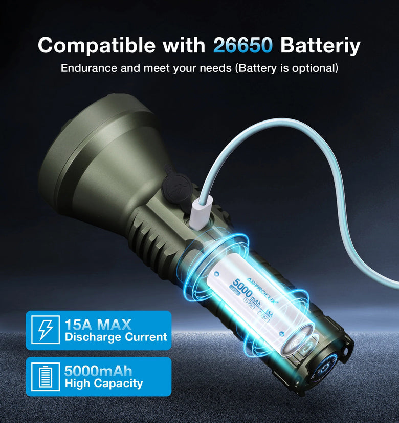 Using 1*HI50 LED, max output is up to 3,050 lumens and max beam intensity is 410,000cdAluminum alloy body design and max beam distance is up to 1,280 metersIt is using 1pcs 26650 battery(optional)Using high-efficiency direct drive driver, type-C usb charging port designHardIII Anodized, anti-slip knurling and good heat dissipation ability