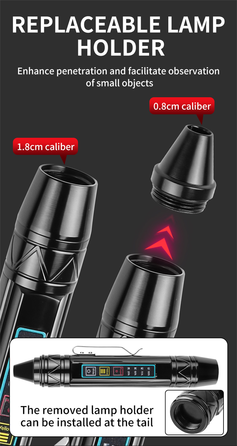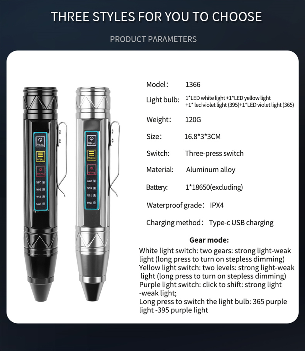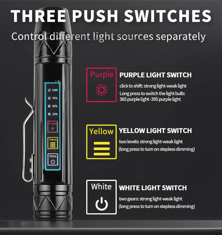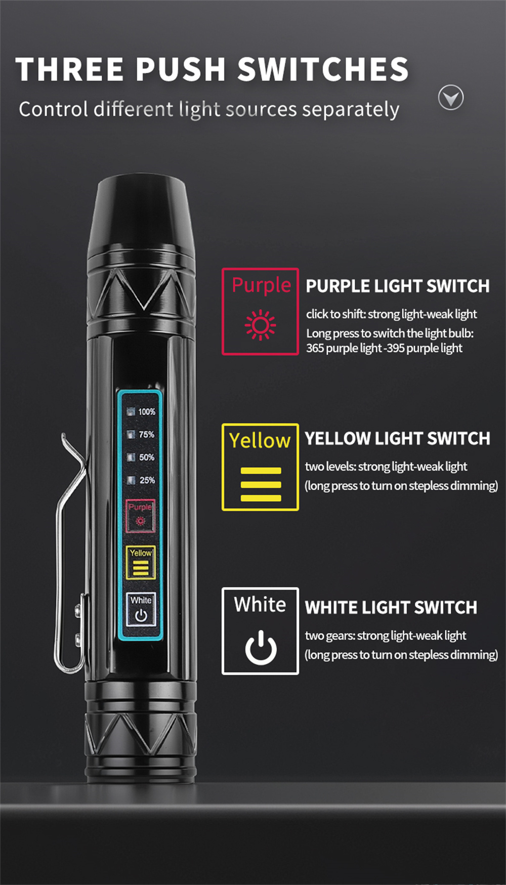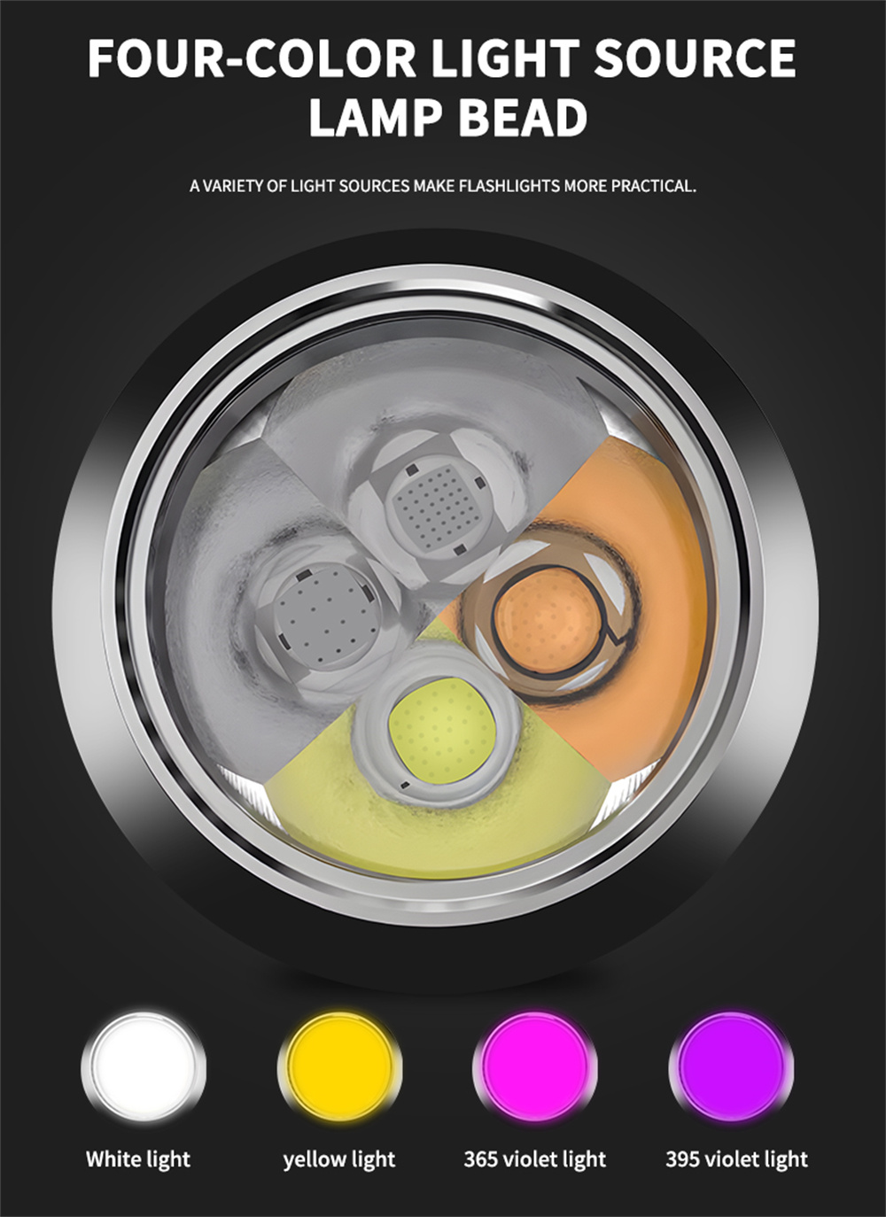 | Light bulb | I*LED White Light +1*LED Yellow Light+1* LED Violet Light (395)+1*LED Violet Light (365) |