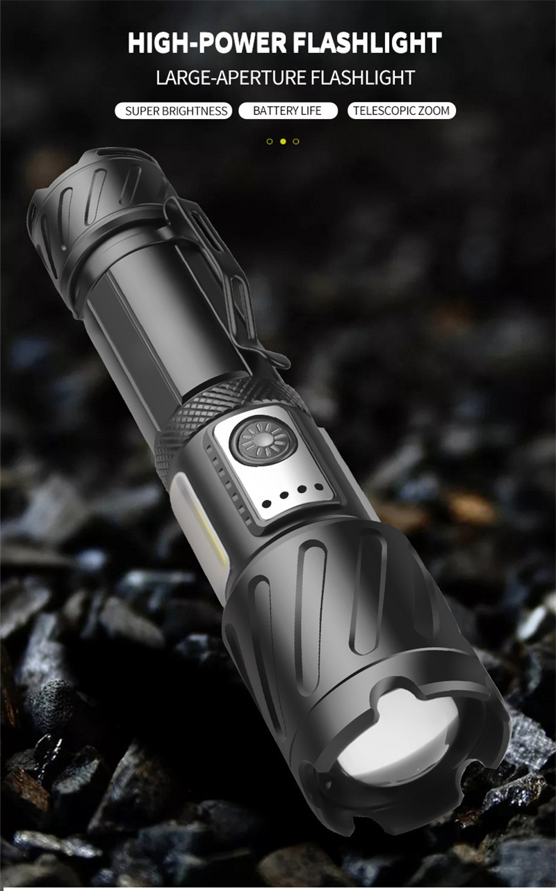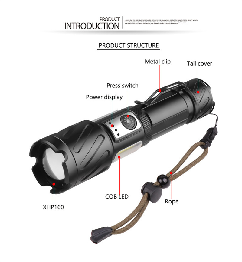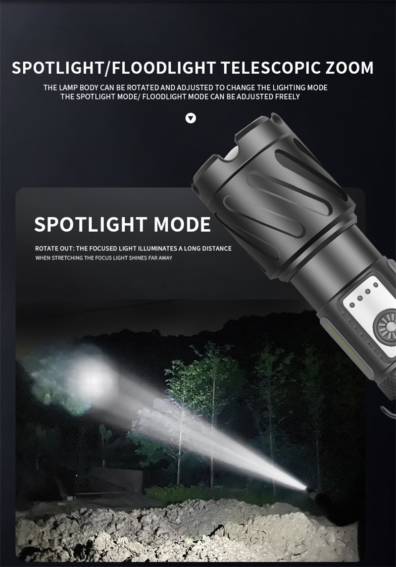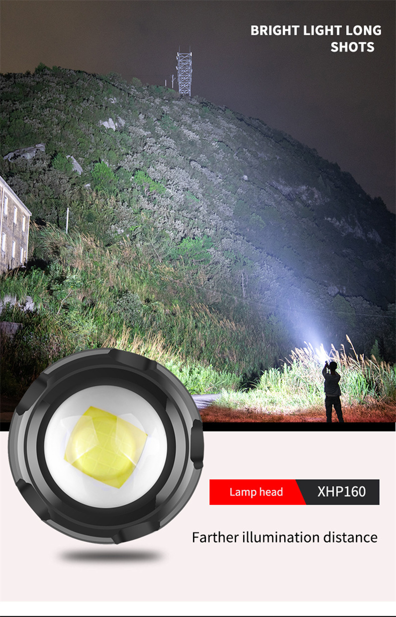 1. Powerful Light: Equipped with XHP160+COB light source, this flashlight provides bright and reliable illumination for outdoor adventures.
