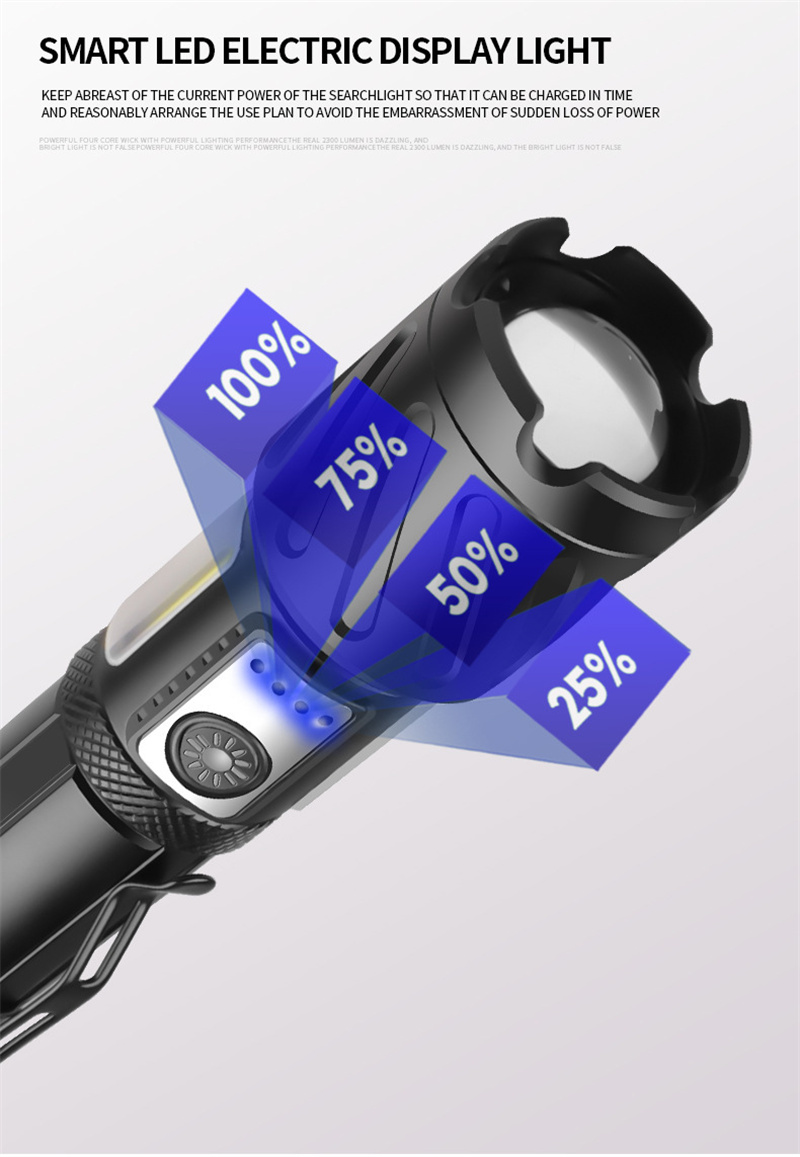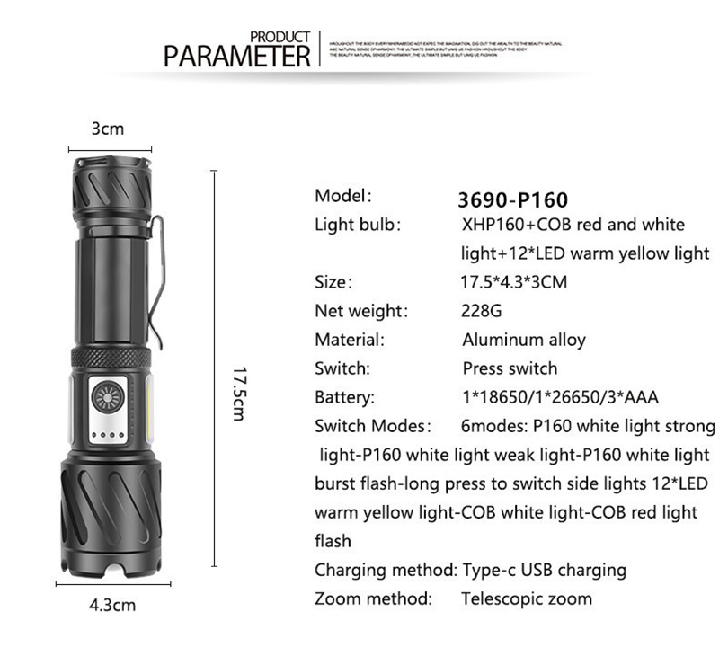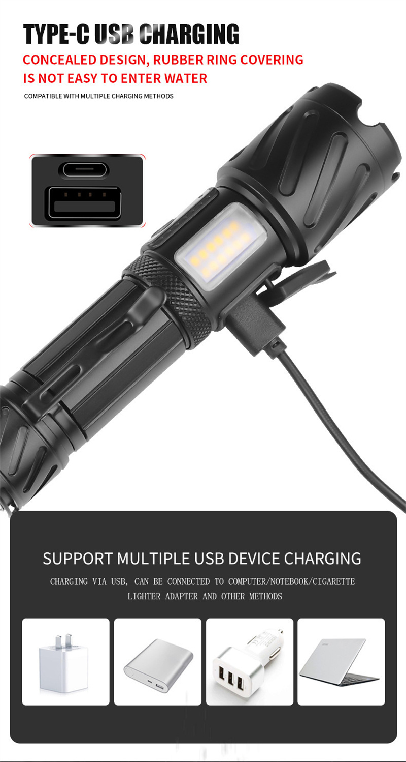 1. Powerful Light: Equipped with XHP160+COB light source, this flashlight provides bright and reliable illumination for outdoor adventures.
