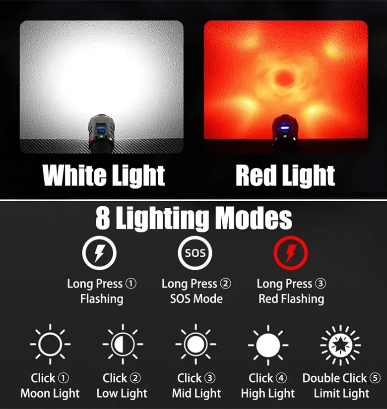 3.8 Lighting Modes: Includes white/red light, strobe, SOS, moonlight mode, and more for versatile use