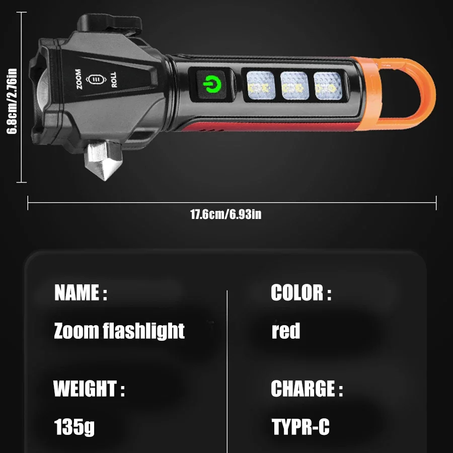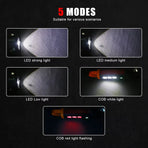 1. Dual Light Source Design: Includes a white LEP main light with adjustable modes (strong, weak, strobe) and SMD side lights that can produce steady white light or red flashing warning lights.