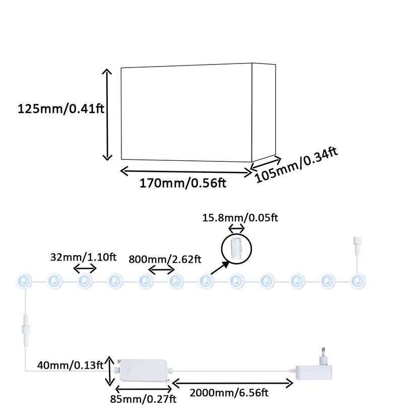 Adapter: 24V 0.5APower: 12WLED Control: Tuya WiFi Music ControllerLamp Body: 12pcs Lamp distance 0.8mWaterproof: Lamp body IP65DIY: Extend and replace with a larger power supplyControl: TUYA APPKit: Fixed buckle 12pcsLength: 14.5 m