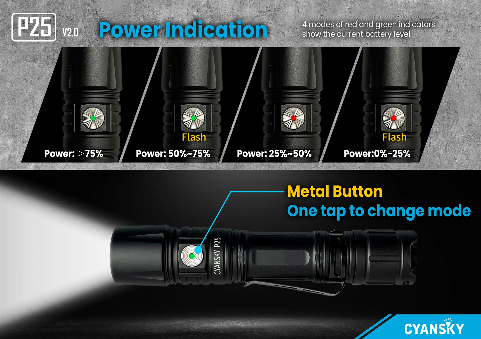 When the flashlight detects that the battery voltage is lower than 3.0V, the flashlight will lower the current working mode until the LOW mode.