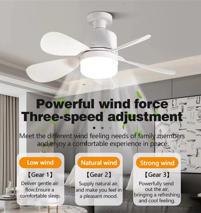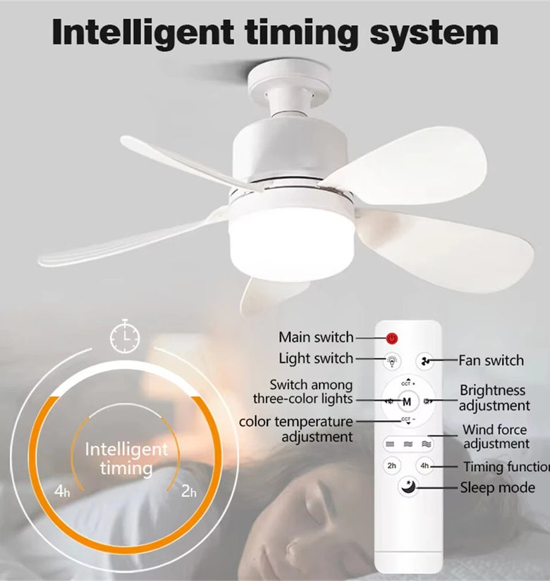 - Standard E27 Socket IntegrationInstalls like a regular bulb—no extra wiring or complex fixtures. Simply screw into any E27 ceiling lamp holder for instant fan-light combination. - Detachable, Strudy ABS BladesThe removable fan blades snap off easily for thorough cleaning. Made from resilient ABS plastic, they resist breakage and ensure long-term durability. - Remote-Controlled TimerBuilt-in 2-hour and 4-hour auto-off timer prevents overcooling overnight. Protect your family from chillsand reduce energy use with a simple remote button. - 3-Color Dimmable LED LightingSwitch between cool white, neutral, and warm white light to suit any mood or task. High-quality LED chips deliver bright, flicker-free illumination (FPF ≤ 0.5%) for eye comfort. - Powerful 3-Speed Silent FanChoose from three airflow settings to customize cooling. The whisper-quiet motor ensures a comfortablebreeze without disruptive noise, perfect for bedrooms, living rooms, and offices.