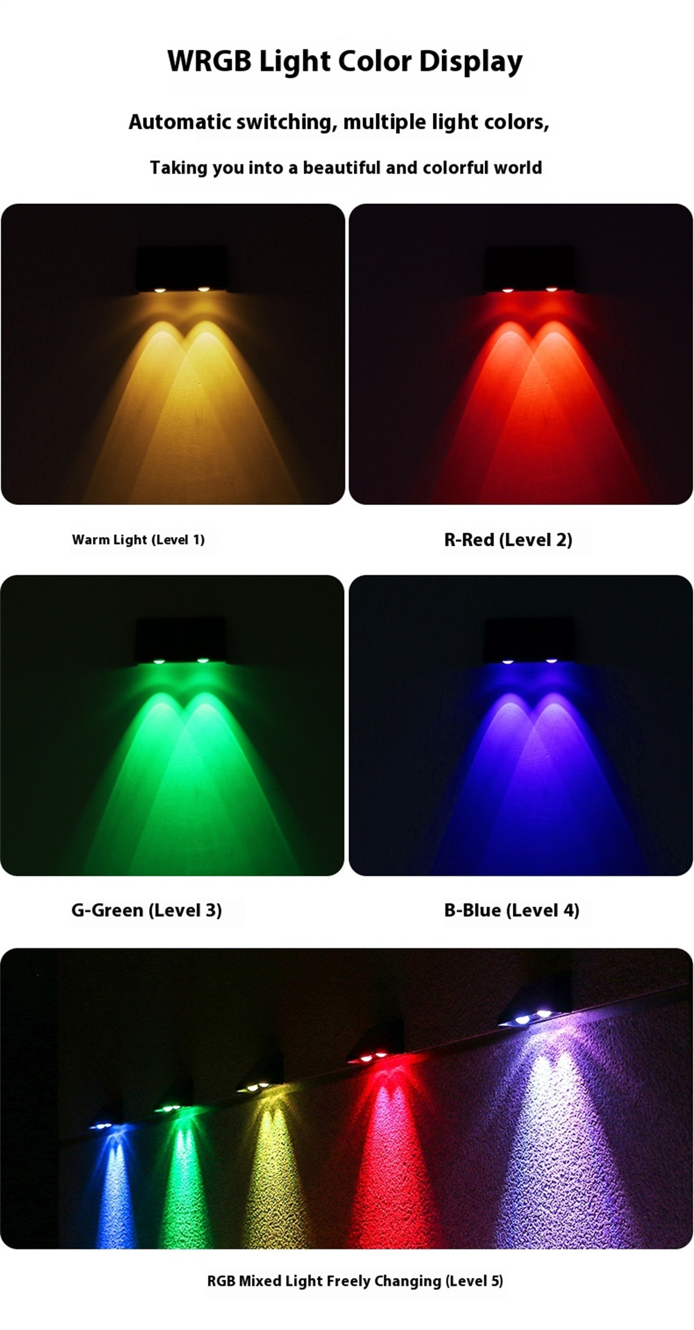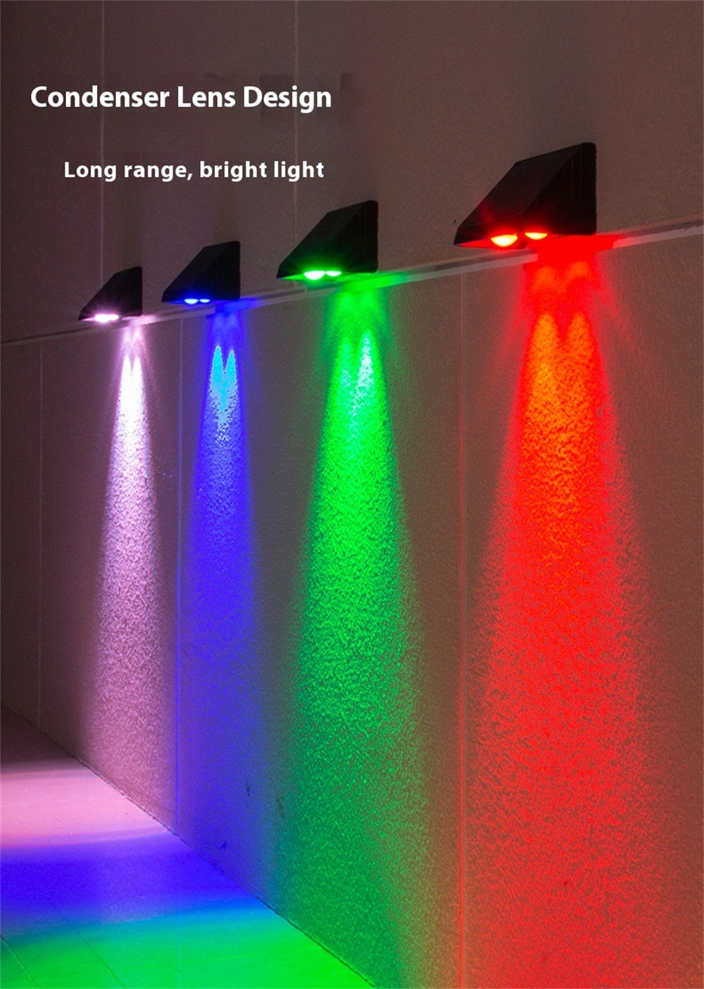 - 5 Lighting Modes: Warm white, red, green, blue, and a free-changing RGB mode to create colorful wall-wash effects for any outdoor space.