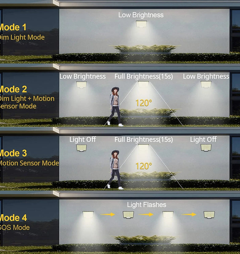 Only 1 Mode: At night, no motion detected, light off; motion detected, bright light on for about 15~20s.