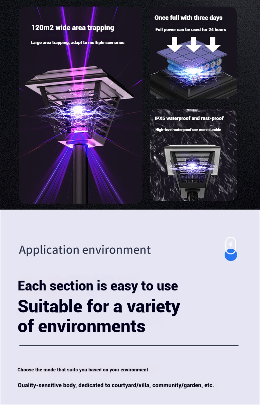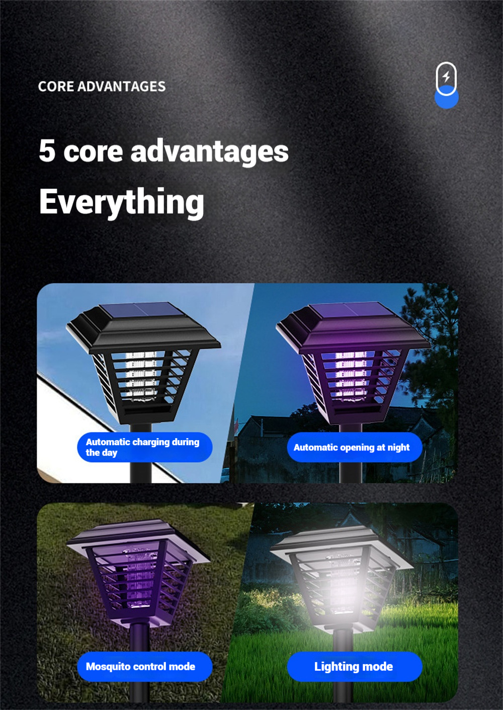 - Dual Functionality: Serves as both a mosquito killer and outdoor lighting.