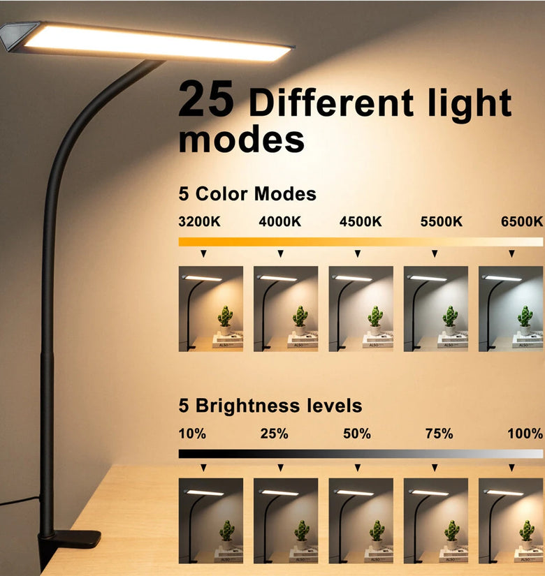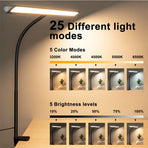 • LED Desk Lamp with Clamp 25 Lighting Modes Eye-Caring USB Powered Flexible Gooseneck Adjustable Color and Brightness Timer Function Energy Efficient for Office Home Reading Study