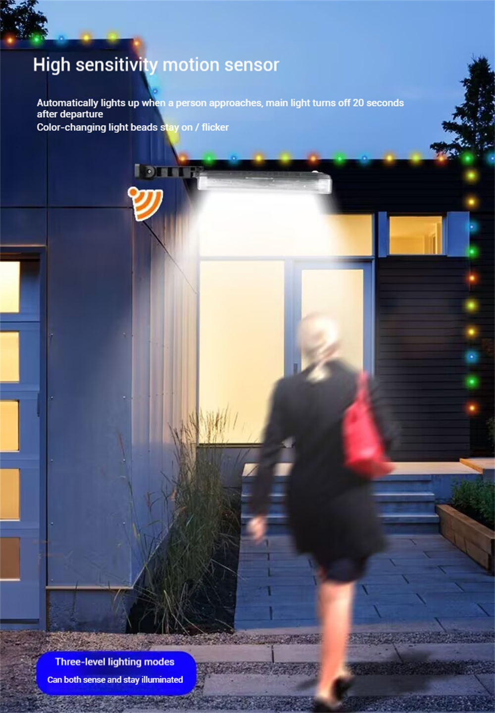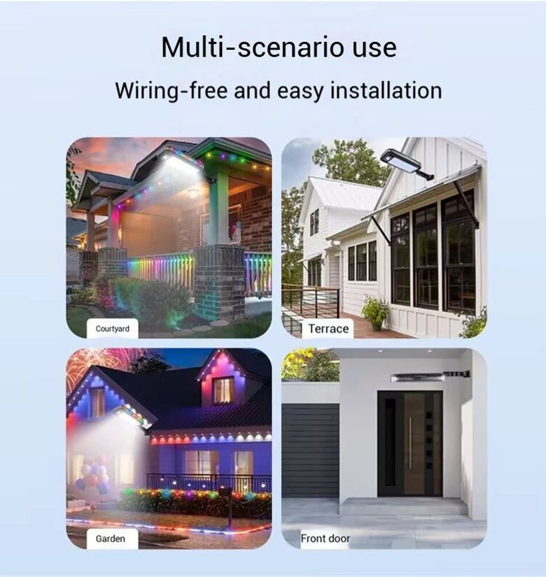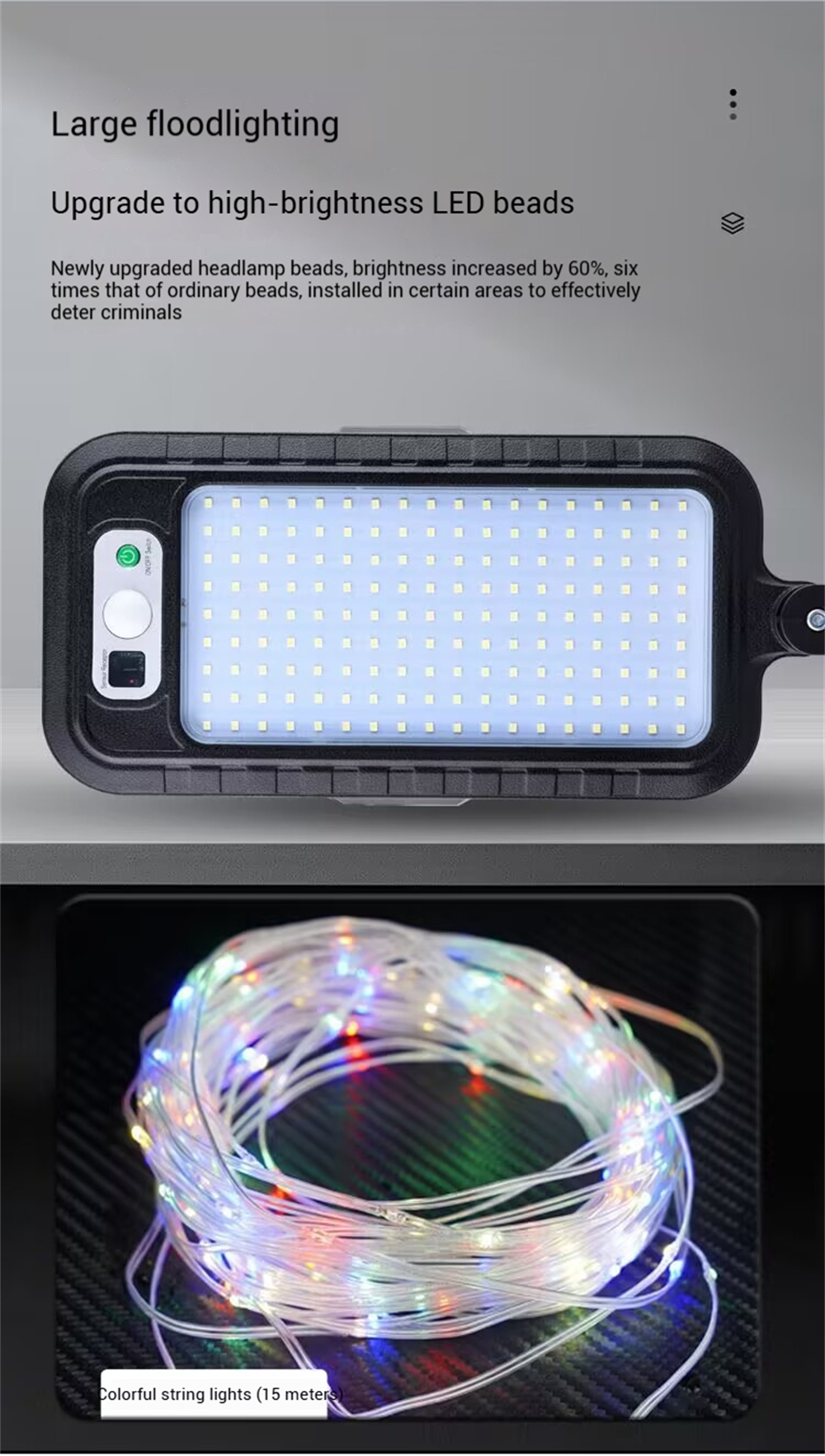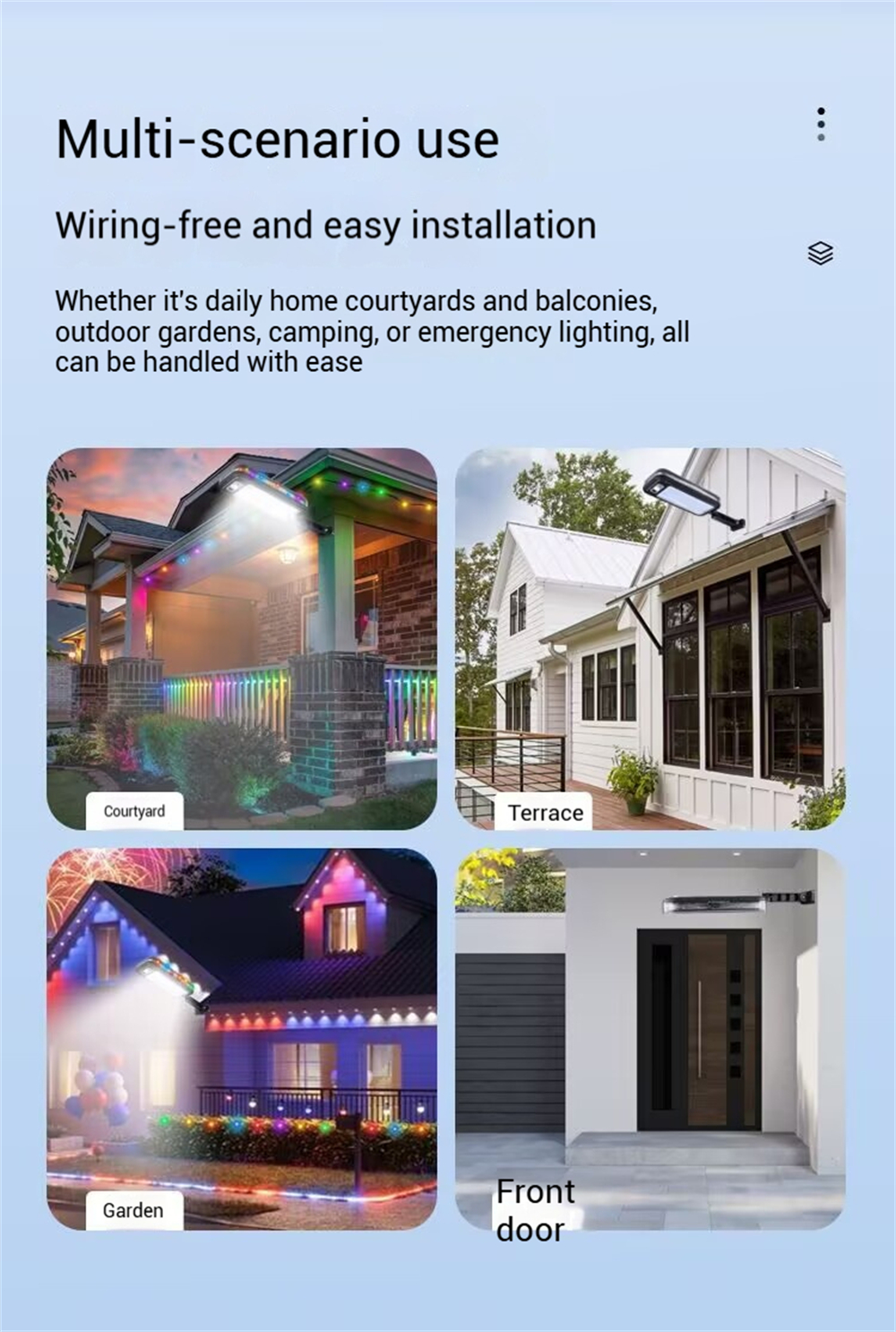 - High-Sensitivity Motion Sensor & Light Sensor Equipped with a responsive motion sensor, the light automatically turns on when movement is detected at night—offering both safety and hands-free convenience for your outdoor space. - Efficient Solar ChargingThe polycrystalline silicon solar panel delivers excellent energy conversion, even in low-light conditions. Enjoy reliable, eco-friendly performance with zero electricity bills all year round. - Long-Lasting Battery PerformanceA built-in high-capacity rechargeable battery stores ample energy during the day, ensuring consistent, bright illumination throughout the night—no frequent charging or wiring required. - Easy Remote ControlSwitch between lighting modes effortlessly with the included remote control. Tailor the lighting to suit your needs without leaving your seat. - 15m Retractable LED String LightsFeaturing a 15-meter retractable RGB string light design, this product adds a cozy, decorative touch to your garden, patio, or outdoor events. Perfect for creating a warm and inviting atmosphere with flexible installation options.