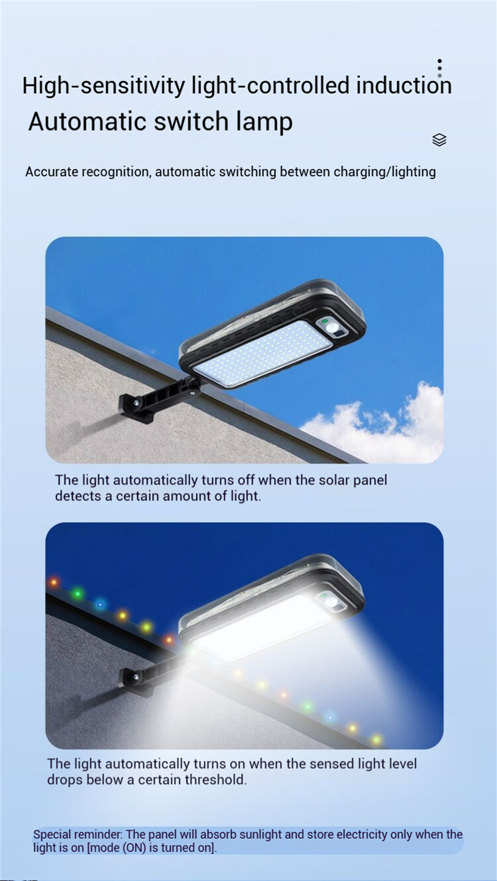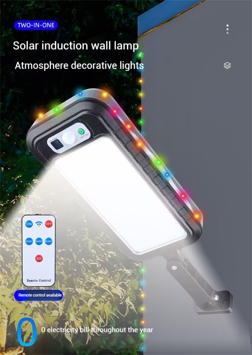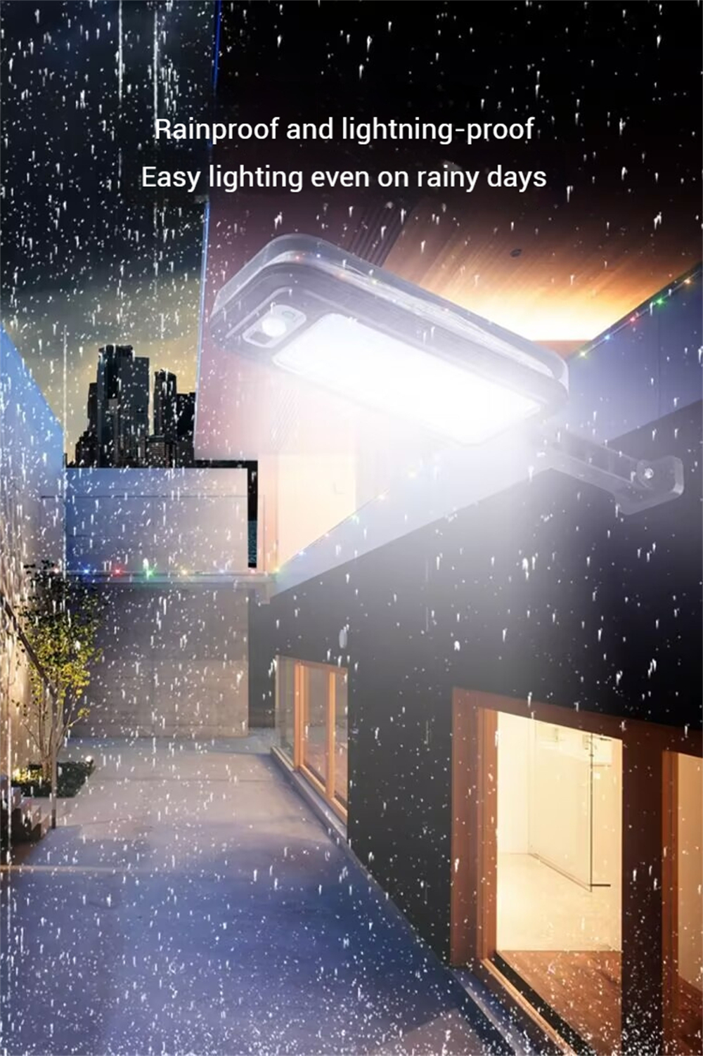 - High-Sensitivity Motion Sensor & Light Sensor Equipped with a responsive motion sensor, the light automatically turns on when movement is detected at night—offering both safety and hands-free convenience for your outdoor space. - Efficient Solar ChargingThe polycrystalline silicon solar panel delivers excellent energy conversion, even in low-light conditions. Enjoy reliable, eco-friendly performance with zero electricity bills all year round. - Long-Lasting Battery PerformanceA built-in high-capacity rechargeable battery stores ample energy during the day, ensuring consistent, bright illumination throughout the night—no frequent charging or wiring required. - Easy Remote ControlSwitch between lighting modes effortlessly with the included remote control. Tailor the lighting to suit your needs without leaving your seat. - 15m Retractable LED String LightsFeaturing a 15-meter retractable RGB string light design, this product adds a cozy, decorative touch to your garden, patio, or outdoor events. Perfect for creating a warm and inviting atmosphere with flexible installation options.