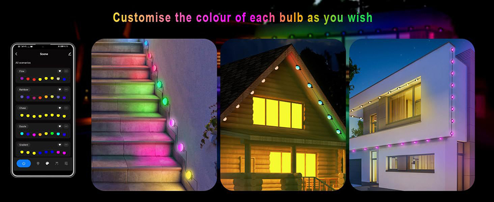 - Smart Control via APP and Remote: Effortlessly manage your garden lights with the convenience of a mobile app or remote control. Adjust brightness, colors, and light modes with just a tap, providing optimal flexibility to suit any outdoor occasion.