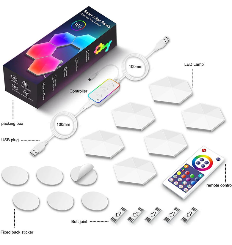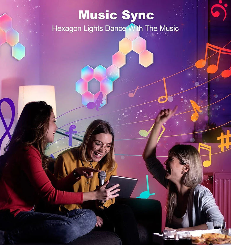 - Triple Control Mode: Adapt the light settings through multiple control options. Use the controller, the Tuya Smart APP, or voice commands with Hey Google or Alexa. Each hexagonal panel can follow the rhythm of music and other audio, transforming songs, videos, or games into a flowing symphony of lights, making family gatherings and home theaters more enjoyable.