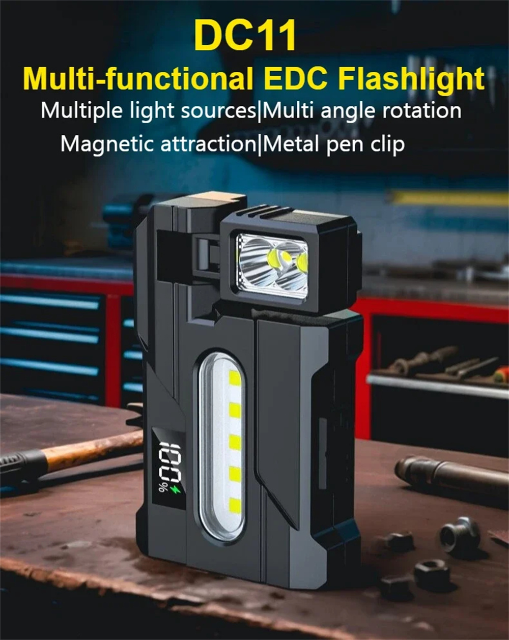 • Multipurpose Dual Light Source LED Keychain Flashlight LCD Display Rotatable Pocket Work Light with Metal Clip EDC Torch for Outdoor Camping Hiking Emergency