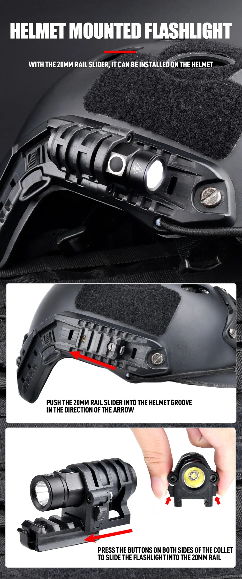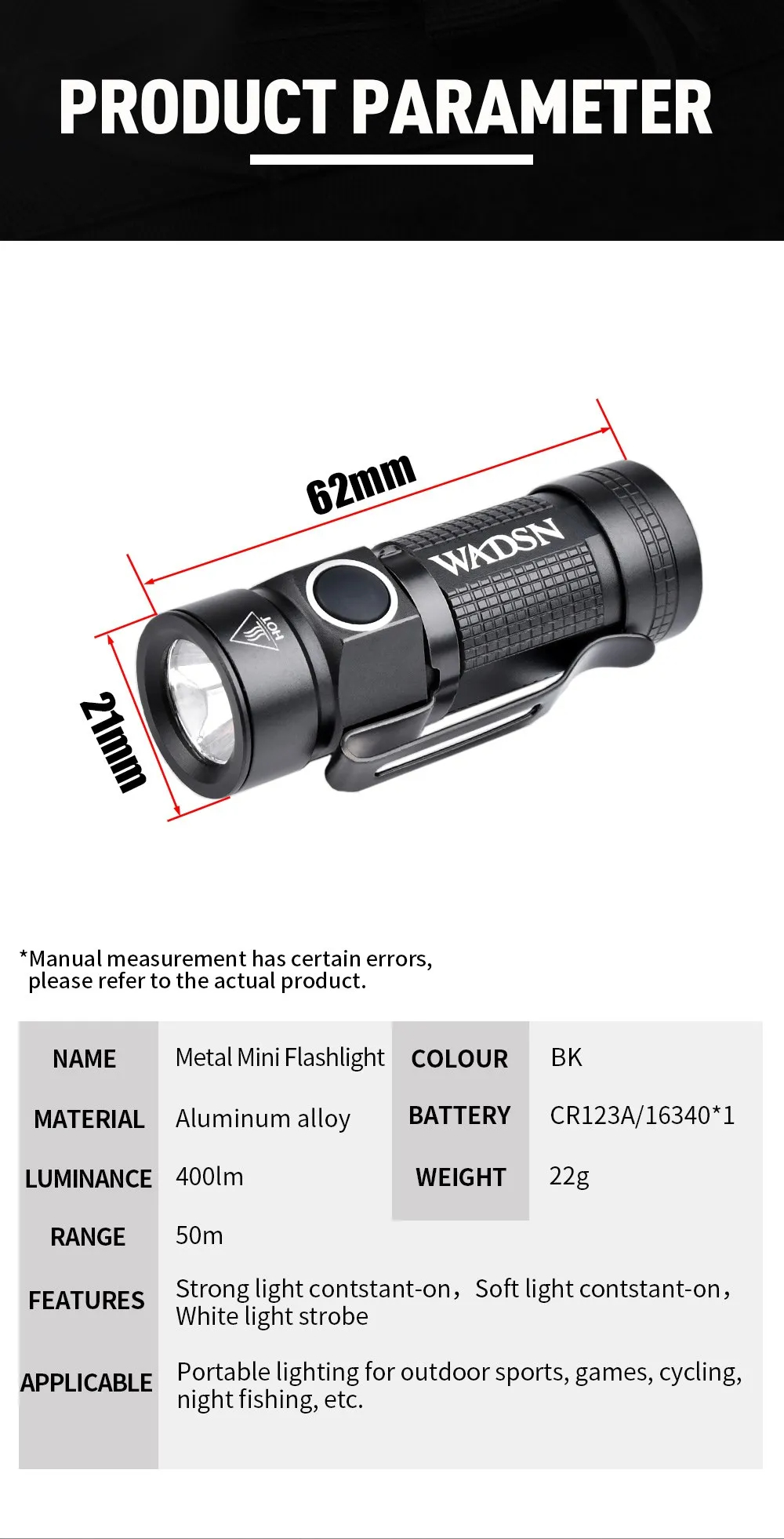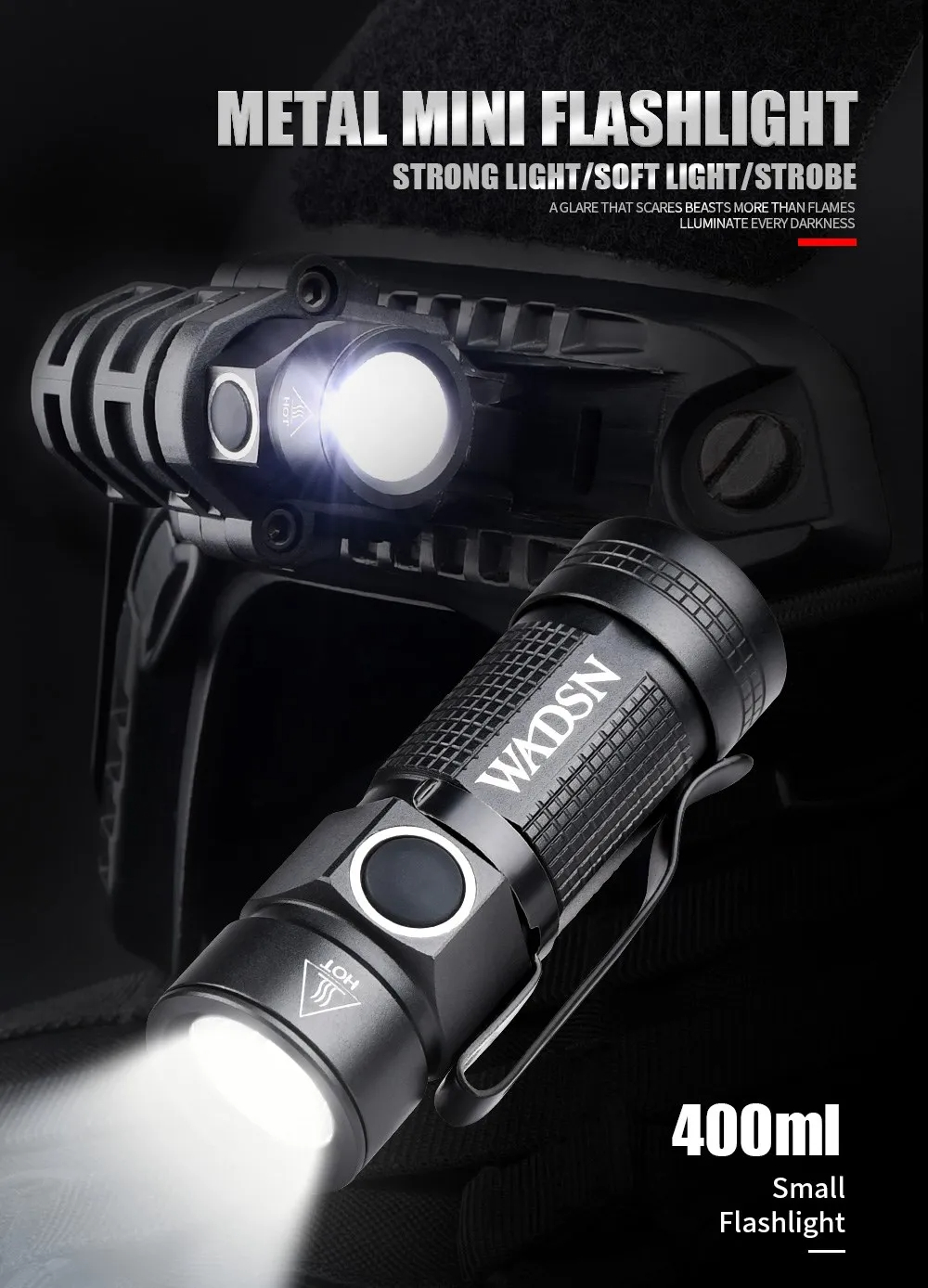 • WADSN 400LM Tactical Flashlight Strobe Uitra-Light 22g Survival Safety Lamp With Hat Clip Power by 16340 Battery Camping Hunting Miniature Torch