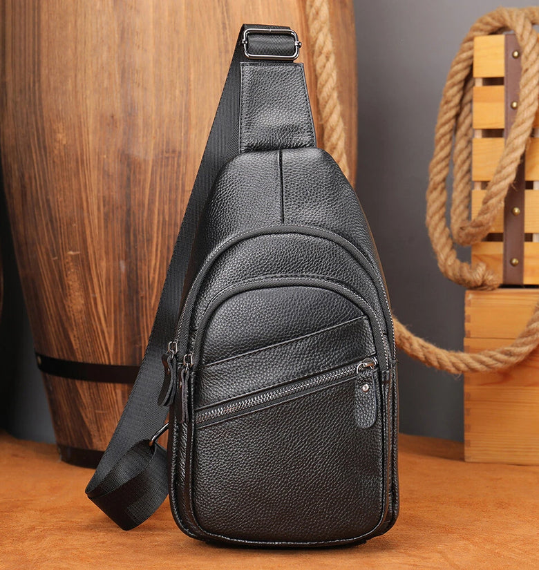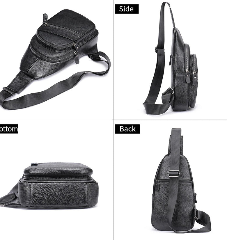 Item Type:Chest BagsMain Material: Genuine LeatherClosure Type: ZipperLining Material: Polyester CottonGender: MenHardness: SoftSize:31*17*5.5cmColor:BlackPattern Type: solid color★You also can use it as shoulder bags,crossbody bags and travel bags.