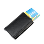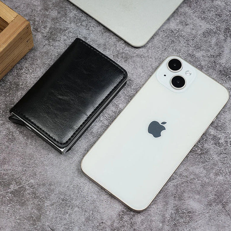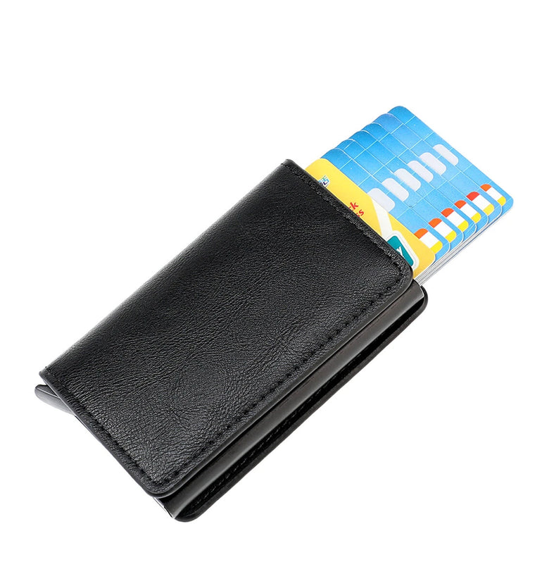 1. STYLISH: This card holder is made of high quality PU leather and metal composite, long lasting, simple and fashionable appearance.2. CARD AUTOMATIC EJECTION: Press the button and the card pops out for easy access, saving time and effort.3. RFID PROTECTION: Ensure your cards are protected from unauthorized scanning with built-in RFID shielding technology.4. MULTIPLE SLOTS: This multi-functional card holder holds up to 6 cards, accommodating credit cards, ID cards, and more.5. COMPACT AND LIGHTWEIGHT: Slim design and lightweight construction make it easy to carry in your pocket or bag without adding bulk.