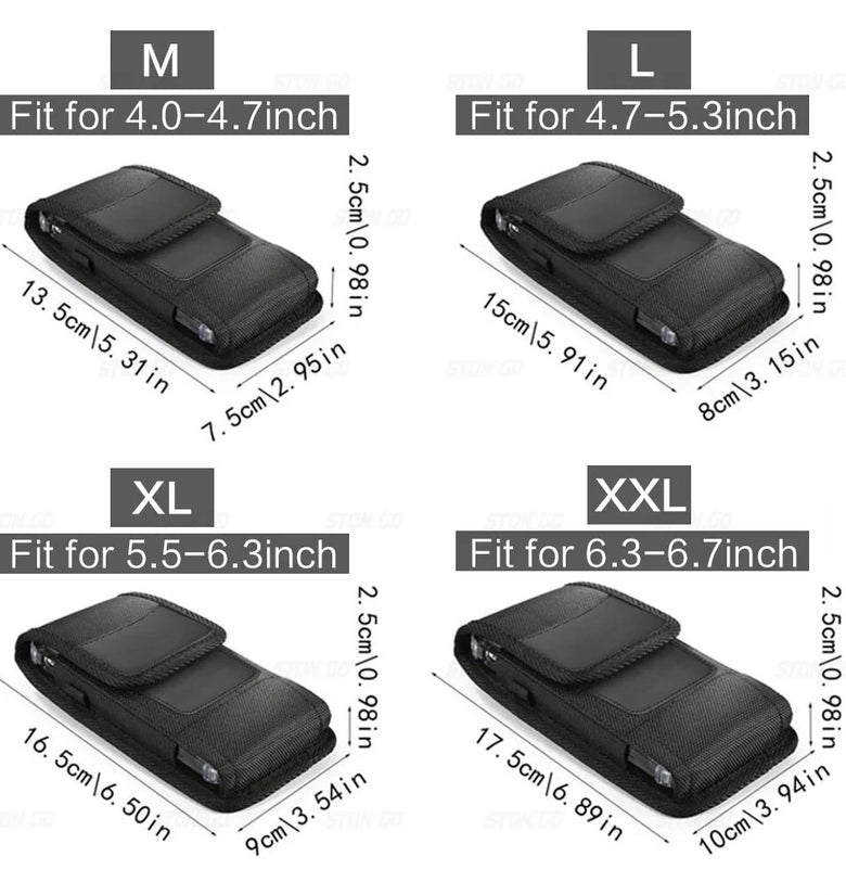 | Compatible Size | L: For 4.7–5.3' phones — 15 × 8 × 2.5 cm, weight: 80g XL: For 5.5–6.3' phones — 16.5 × 9 × 2.5 cm, weight: 85g XXL: For 6.3–6.7' phones — 17.5 × 10 × 2.5 cm, weight: 90g |