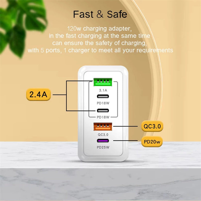 1. Versatile Charging: With a total of 5 ports (2 USB-A and 3 USB-C), this charger can simultaneously charge multiple devices like smartphones, tablets, laptops, and more.
