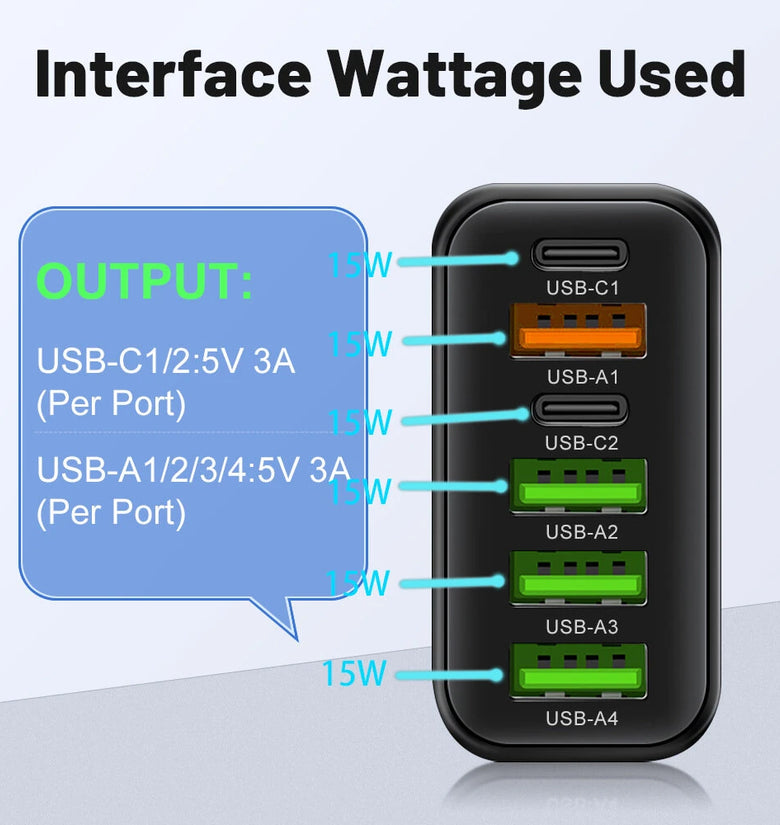 | Output | USB-C1/2:5V 3A(Per Port) USB-A1/2/3/4:5V 3A(Per Port) USB-C1/2+USB-A1/2/3/4:5V 3A