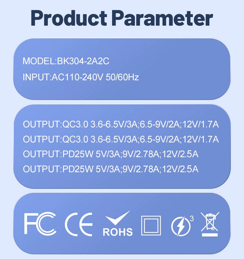 | Output | QC3.0 3.6-6.5V/3A;6.5-9V/2A;12V/1.7A QC3.0 3.6-6.5V/3A;6.5-9V/2A;12V/1.7A PD25W 5V/3A;9V/2.78A;12V/2.5A PD25W 5V/3A;9V/2.78A;12V/2.5A |