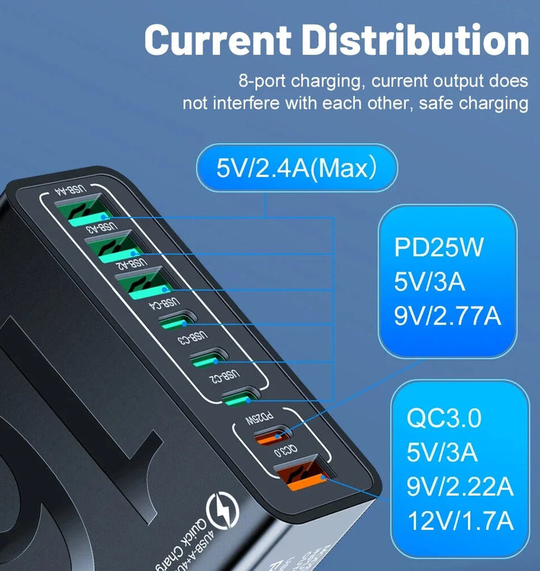2. Multiple Ports: 8-port USB charger with 4 USB-A and 4 USB-C ports for simultaneous charging of multiple devices.