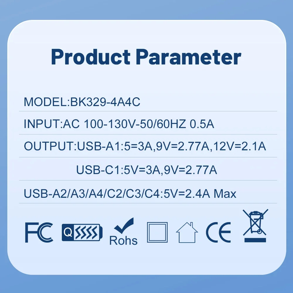 • BK329-4A4C 8-Port USB PD Charger 4USB-A+4USB-C PD QC4.0 3.0 2.0 FCP SCP Fast Charging Wall Charger Adapter EU Plug for iPhone 16 15 Pro 14 13 12 Pro Max for Huawei Mate XT for Xiaomi 15pro