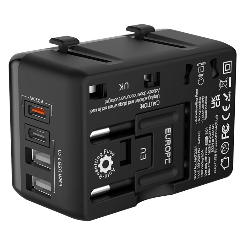 USB Interface: 2*USB + 1*Type-C + 1*PD20WProduct Dimensions:72x50x39mmFroduct Weight:109gInput Voltage:100V-250V AC, 50/60HZPower Rating:100V-240V AC, 8A Max, 800W-1920WCompatible: PD20WType-C PD:5V3A(15W), 9V/2.22A(18W), 12V/1.67A(20W)Single USB Output:5V/2.4A,SingleType-C Output:5V/2.4.AAutomatic fusing fuse: 8ACompatibiity: USA / UK / EU / AUS / Canada and much more.