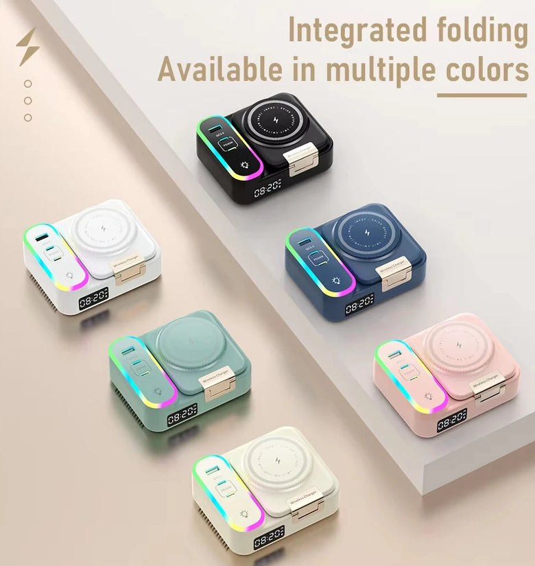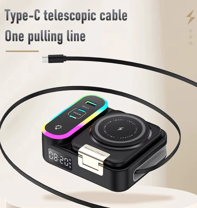 1. 8-in-1 Functionality: Combines a wireless charger (15W), retractable Type-C cable, RGB lighting effects, foldable phone stand, and digital clock for enhanced convenience and multi-device charging.