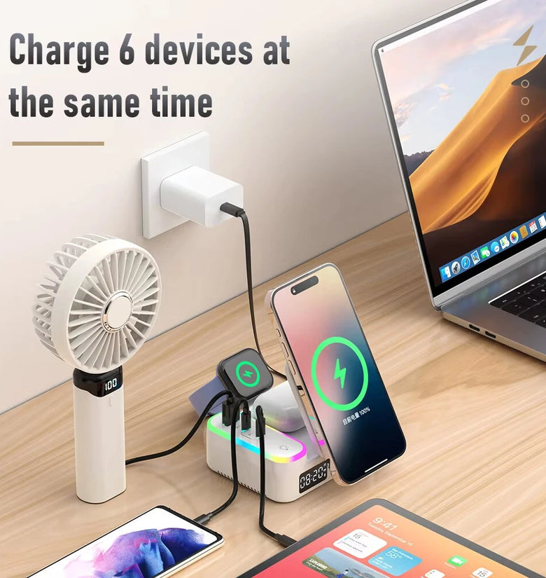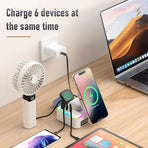 2. Charging Capability for Multiple Devices: Simultaneously charges up to six devices, including smartphones, headphones, smartwatches, and small gadgets via USB ports and wireless pads.