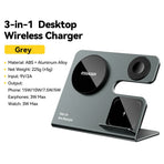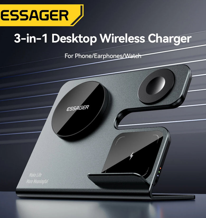 Specifications:Brand: ESSAGERModel: OJD-119BName: 3 in 1 Desktop Wireless ChargerMaterial: ABS+Aluminum AlloyNet Weight: 225gInput: 9V/2AOutput Output: Phone: 15W/10W/7.5W/5W, Earphone: 3W MAX, Watch: 3W MAXColor: GreyPackage Includes:1 x 3 in 1 Desktop Wireless Charger