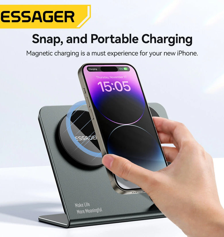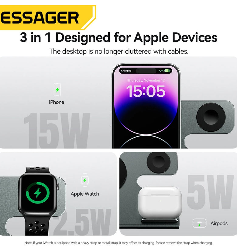 • ESSAGER 3 in 1 PD15W High Power Magnetic Desktop Wireless Charger for iPhone 15 14 13 12 Pro/Max/Plus for Apple Watch 9/8/7/6/5/4/3/2/SE/Ultra 2 for AirPods 3/2/Pro