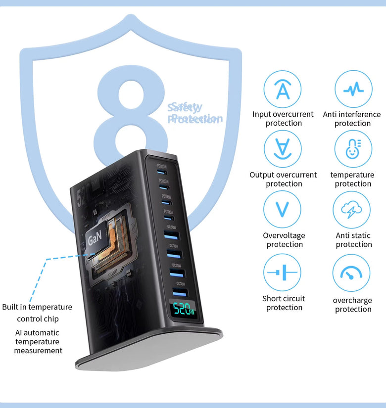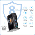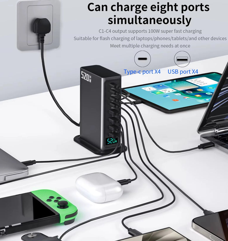Output | Output Power (USB-C): 5V==3A/9V==3A/12V==3A/15V==3A/20V==5A (100W Max) Output Power (USB-A): 5V==3A/9V==3A/12V==2.5A (30W Max) Combined Output Power: TYPE-C1+C2+C3+C4+USB-A1/A2/A3/A4: 65W+30W+30W TYPE-C2+C3+C4+USB-A1/A2/A3/A4: 65W+30W+30W TYPE-C1+C2+C3+C4+A1/A2/A3/A4: 45W+30W+30W+30W TYPE-C3+C4: 5V==3A USB-A1/A2/A3/A4+A4/A3/A2/A1: 5V==3A |