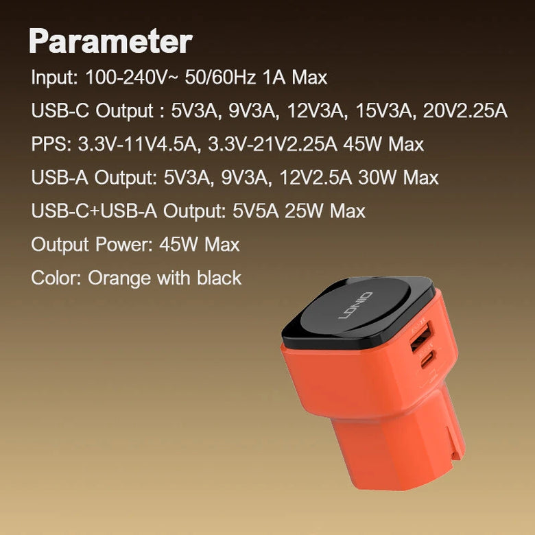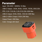 Output | USB-C Output: 5V3A, 9V3A, 12V3A, 15V3A, 20V 2.25A PPS: 3.3V-11V 4.5A, 3.3V-21V 2.25A 45W Max USB-A Output: 5V3A, 9V3A, 12V2.5A 30W Max USB-C + USB-A Output: 5V5A, 25W Max |