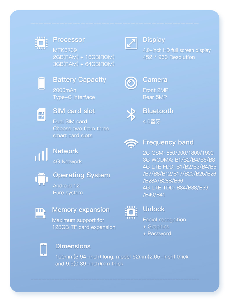 OS: Android 12.0 CPU: MTK6739WW quad core 1.5G RAM: 2GB/3GB RAM ROM: 16GB/64GB ROM Card Extend: Supports an external TF card up to 128GB |