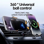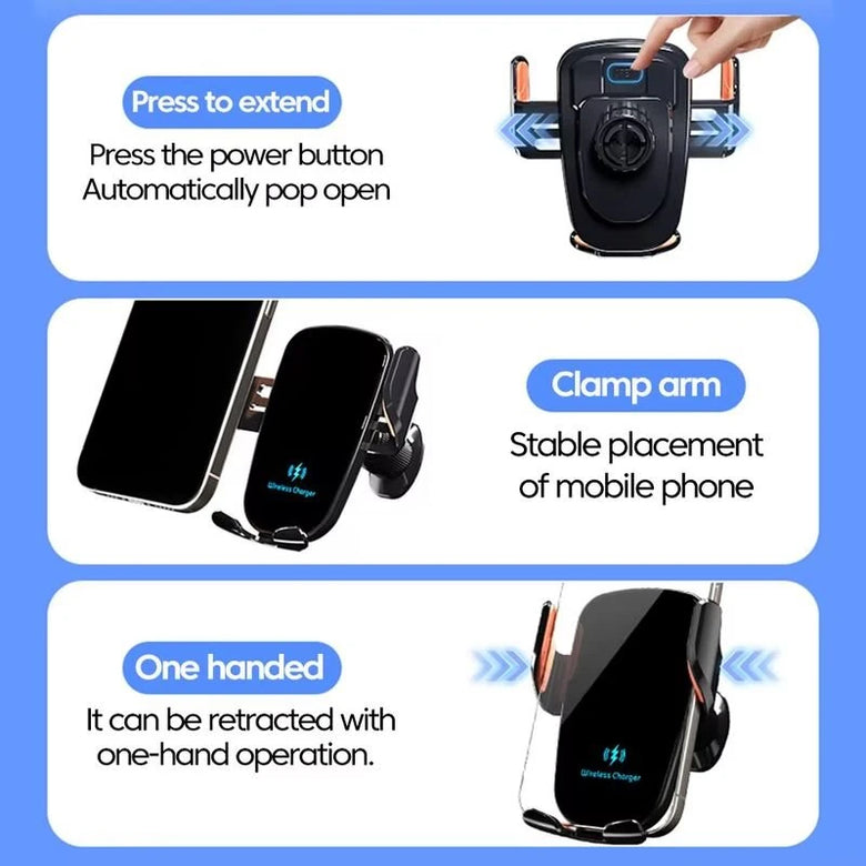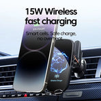SpecificationsProduct Name: 15W Car Magnetic Wireless Charger HolderMaterial: ABS+PCProduct Dimensions: 112mm x 80mm x 50mmBox Dimensions: 135mm x 98mm x 55mmWeight: Approx. 145gCompatibility: Suitable for devices with screen sizes ranging from 4.7 to 7.2 inchesFeatures:1. 15W Fast Wireless Charging: Efficient power delivery for quick charging with built-in safety features against overheating.2. 360° Adjustable Ball Control: Allows horizontal and vertical rotation for optimal viewing angles during navigation or calls.3. Triangular Gravity Support: Securely locks the phone’s center of gravity, ensuring stability even on bumpy roads.4. One-Hand Operation: Easy phone placement and removal with press mechanism and auto-retract clamp arms.5. Scratch-Resistant Glass Front: Features 2.5D tempered glass for a sleek finish and added protection against daily wear.Package Includes:1 x Wireless Charging Car Holder