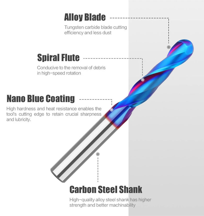 • 1/4 Inch/6.35mm 8mm Shank Spiral Up Cut Ball Nose End Mill Router Bit with Nano Blue Coating Milling Cutter Tungsten Carbide Flutes