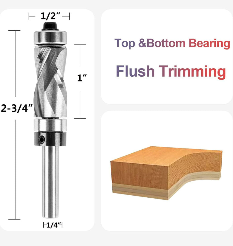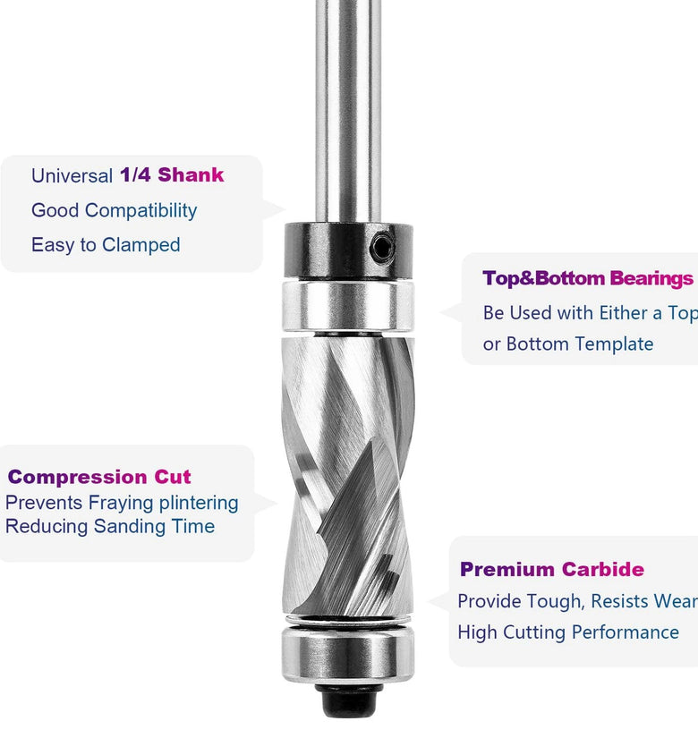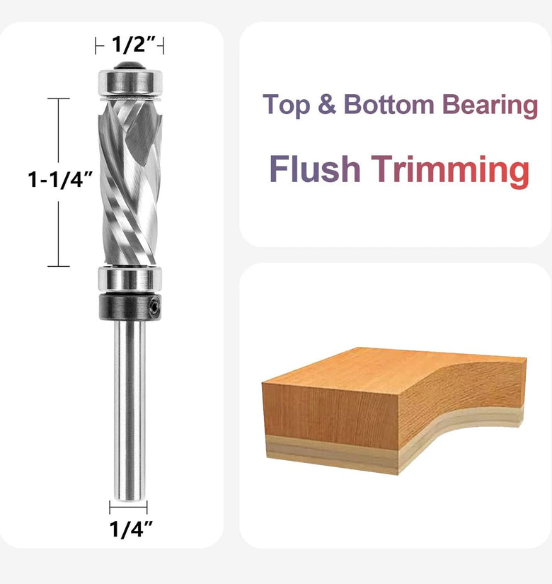 Suitable for both table-mounted and handheld routers, this flush trim bit is ideal for all flush trim scenarios, pattern work, and templating.