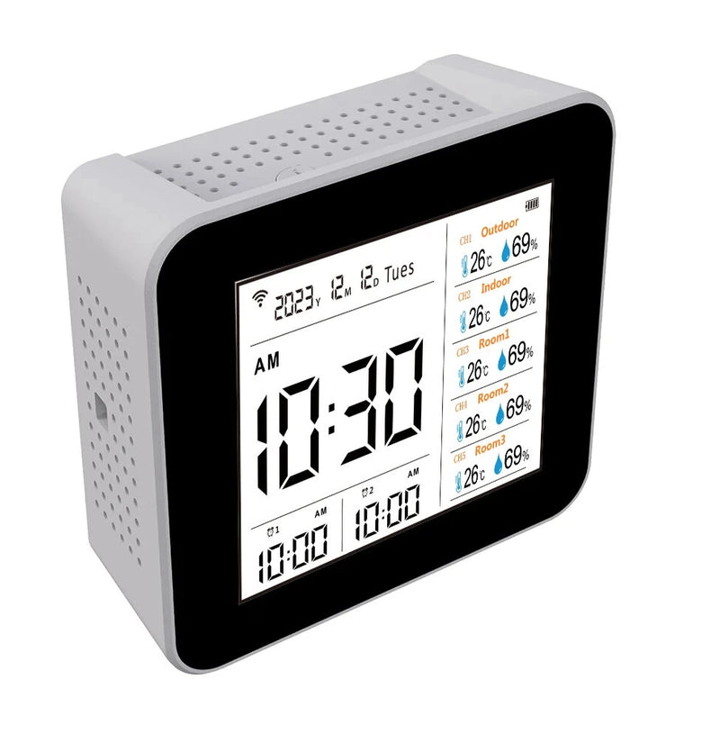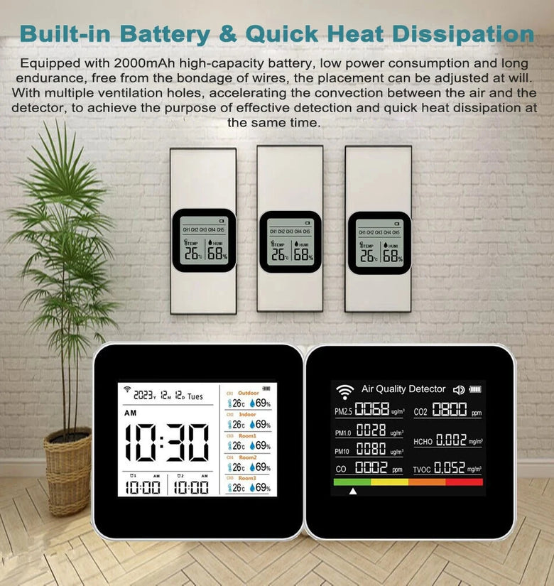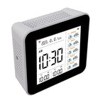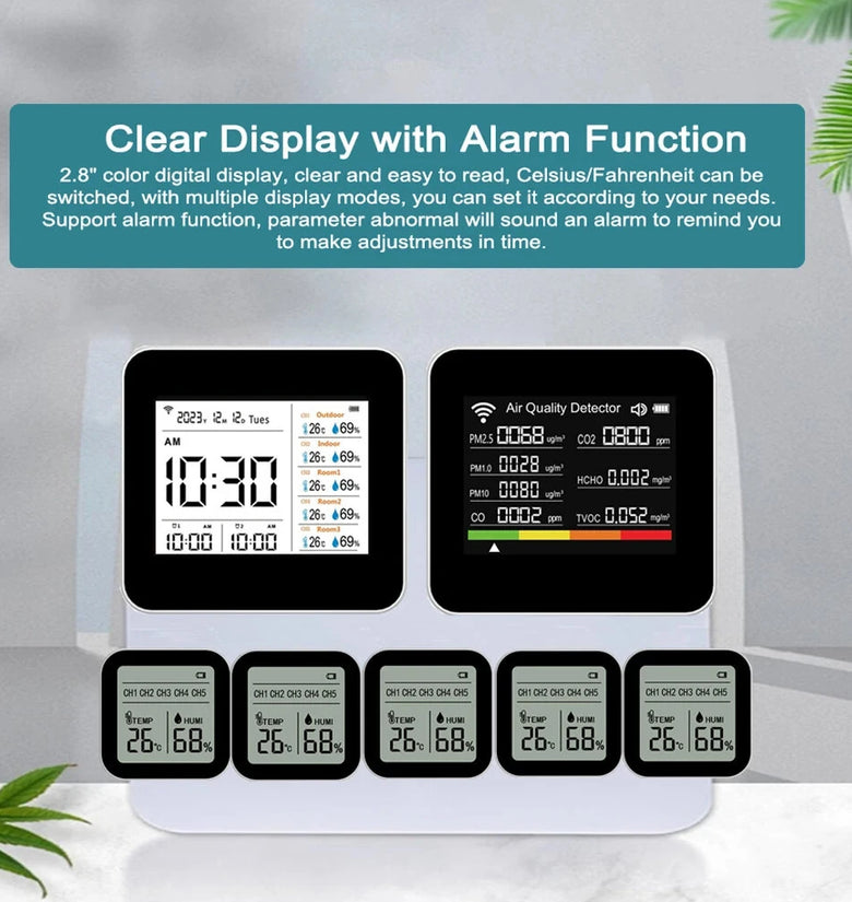 Comprehensive 20-in-1 Monitoring: The Tuya Multifunctional Air Quality tester offers an all-in-one solution for real-time monitoring of CO2, CO, TVOC, HCHO, PM2.5, PM1.0, PM10, temperature, and humidity. With its large digital screen, it displays all these parameters clearly, along with time and date, functioning as an alarm clock as well.
