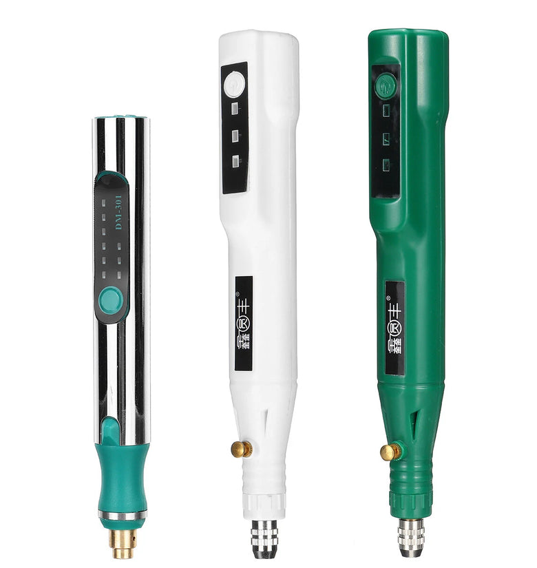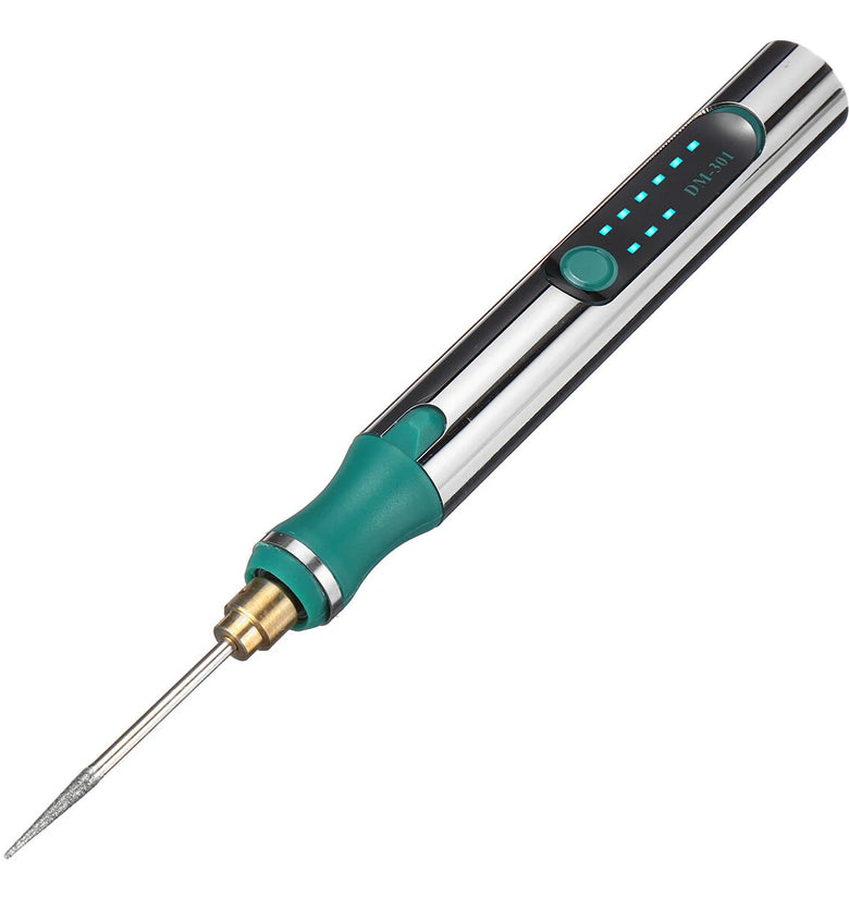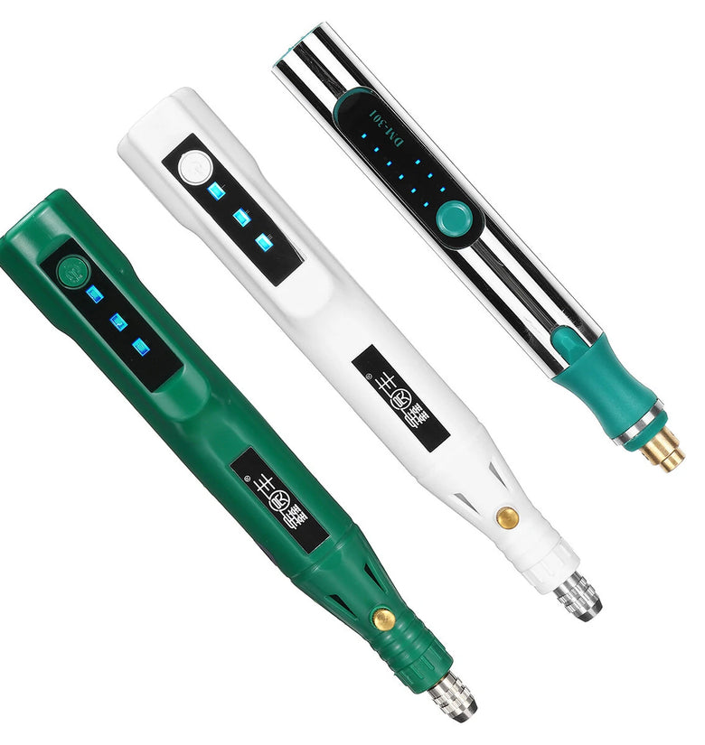 ● Compact size, lightweight and portable, cordless design for easy operation. ● Electroplated alloy body with copper collet and quailty engraving-needle, practical and can provide high working efficient. ● Three gears of speed adjustable, you can adjust the working speed you want for different usage. ● Equipped with electric quantity indicator light and overload indicator light, you can know the use situation of engraving pen in real time. ● Perfect electric drill for cutting, engraving, milling, grinding, polishing, removing and drilling. ● Manual sculpture, Suitable for kinds of material engraving and grinding, such as wood, stone, peach-pit, egg, crafts, glass, ceramics, and etc. | |