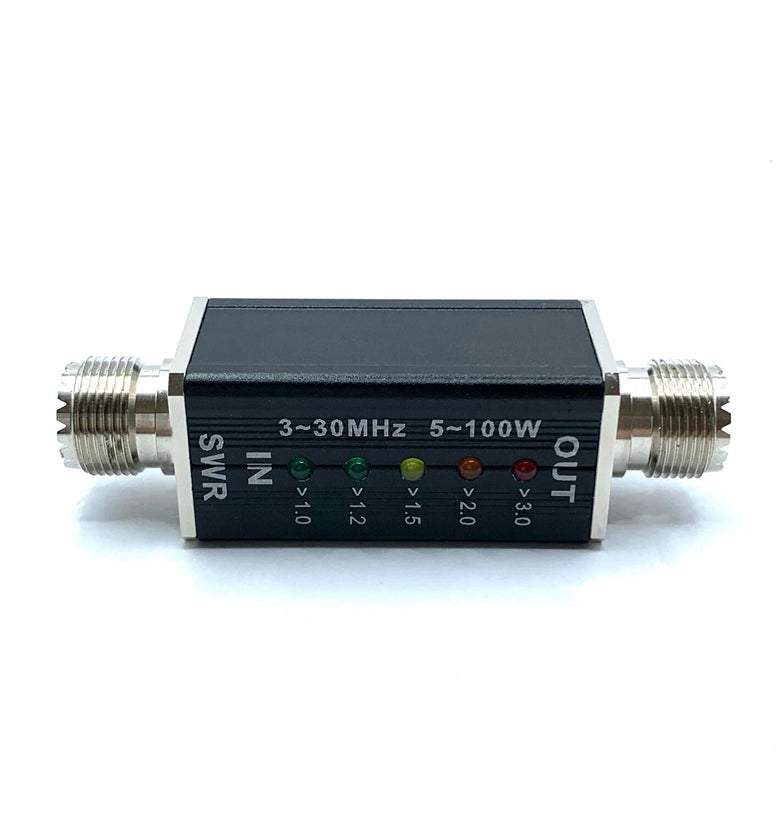 This product is a short band LED light indicating SWR meter.  Powered by RF-tapped power, no batteries are required, and easy to carry.  SWR meter is a device used to measure radio frequency signals using 5 LEDs to indicate the strength of the signals, with different colors to indicate different ranges of SWR.  It is used to measure and display the SWR of shortwave radio signals in the frequency ranges of 3-30MHz.  Input power does not exceed 100W, the smallest LED (>1.0 corresponds to the green light) light requires 5W power, suitable for a variety of shortwave radio equipment.
