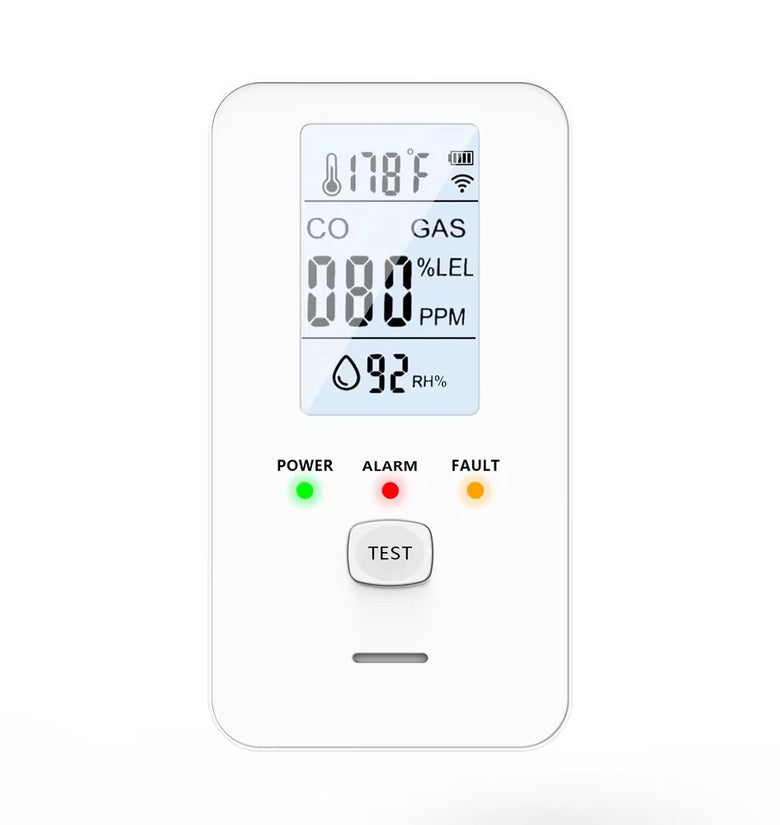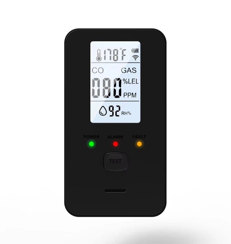 The integrated digital screen displays detailed information such as CO ppm levels, gas concentration, temperature in °F/°C, and humidity percentage for easy real-time monitoring.