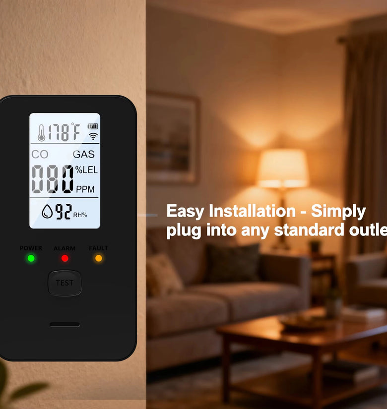 • 4 in 1 Gas Alarm Methane Carbon Monoxide Temperature Humidity Monitor High Decibel Warning LCD Display Plug and Play Safety Device