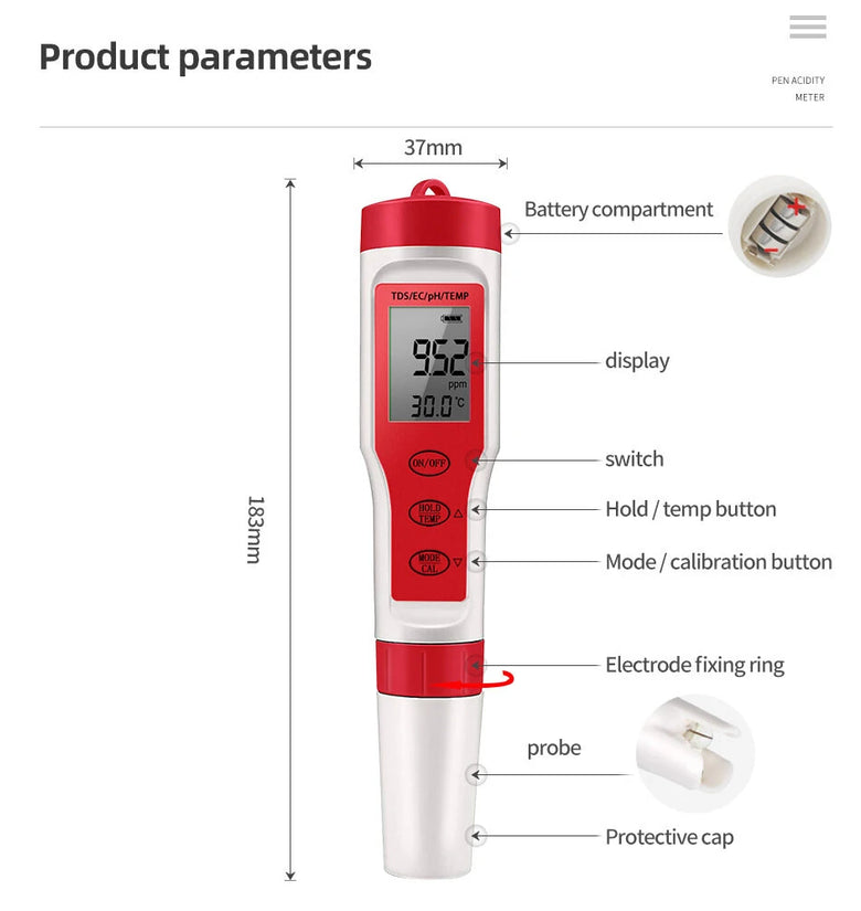 ► Measuring range: pH:0.00-14.00pH; TDS: 0-19990ppm; EC: 0-19990μS/cm