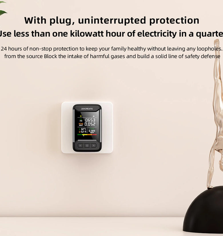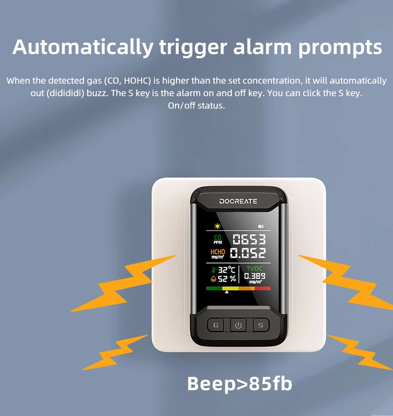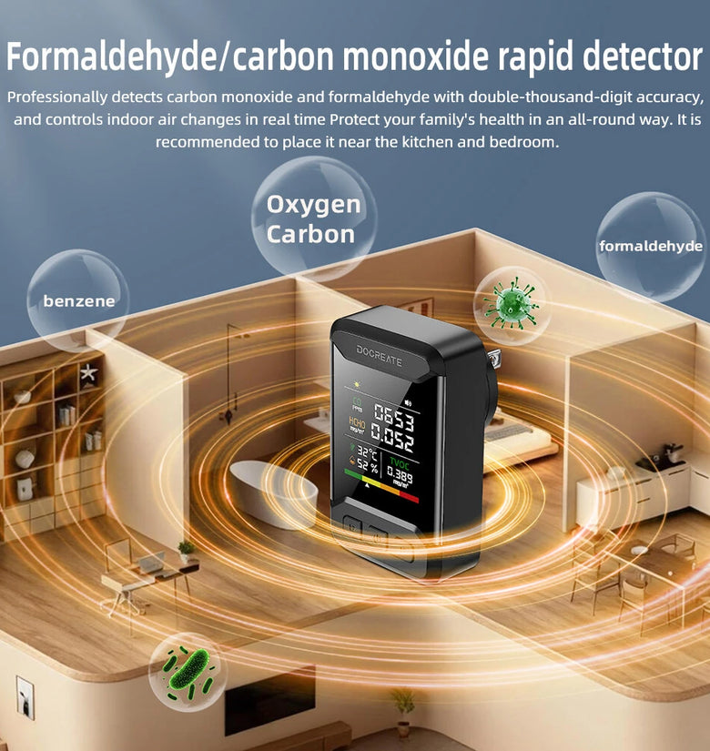 Equipped to measure carbon monoxide (CO) levels up to 1000ppm and formaldehyde (HCHO) with precision, ensuring a healthy living environment.