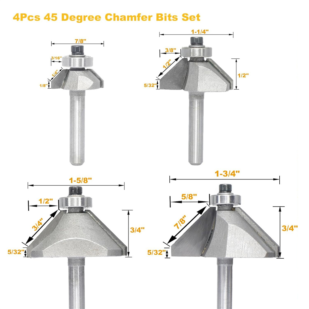 • 4PCS 45 Degree Chamfer Router Bit Set 1/4" Shank Carbide Tipped 1/4" 1/2" 3/4" 7/8" Bevel Length for Edge Forming Woodworking Tool