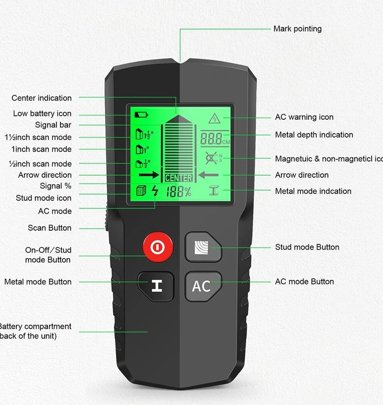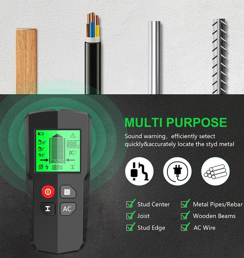 • 5-in-1 Stud Finder Wall Scanner with Backlit Display - Accurately Detect Wood Metal Studs Live AC Wires Enhanced Depth Detection Essential Tool for Home Improvement and Construction
