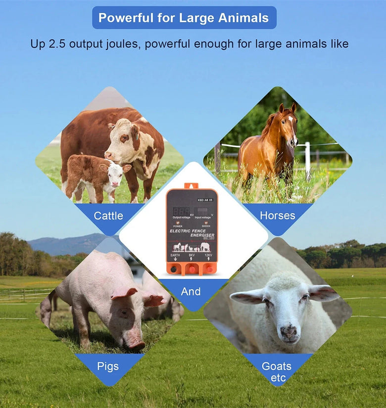 【LCD Power Display】: 2.5 Joules electric fence charger with LCD display - real-time display of input voltage and battery voltage level, ensuring you always know the status of the fence.