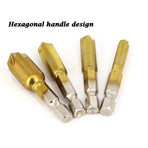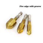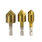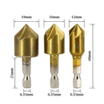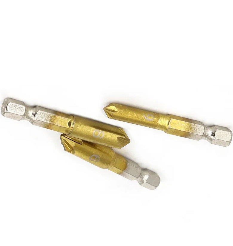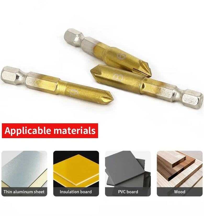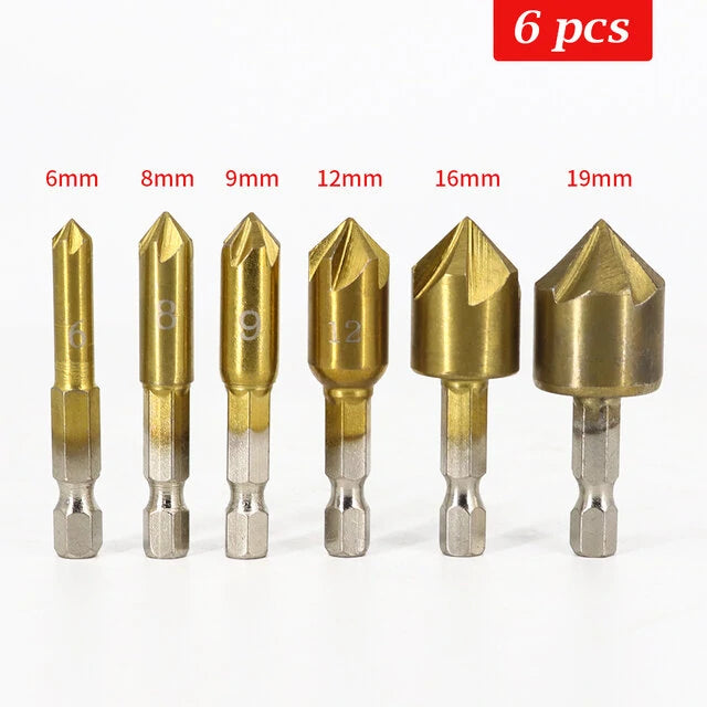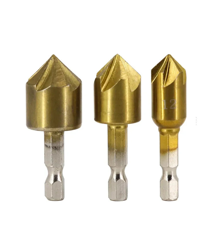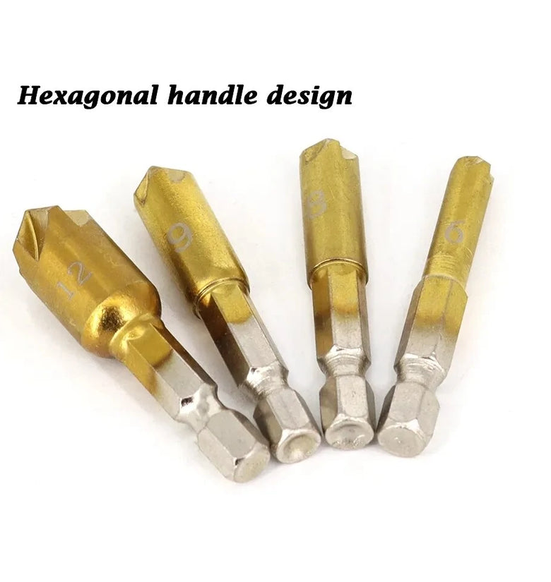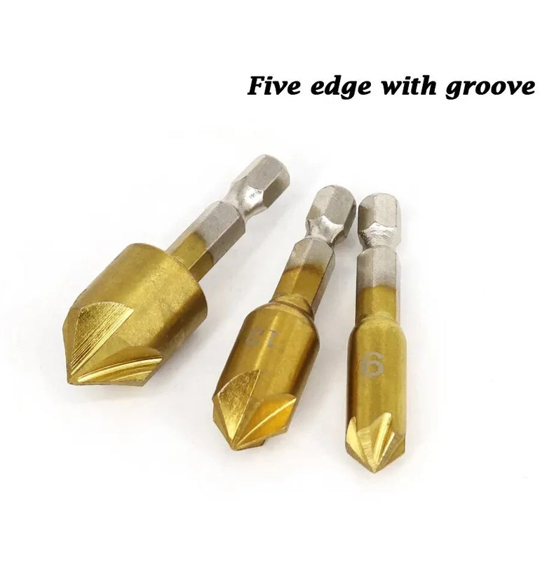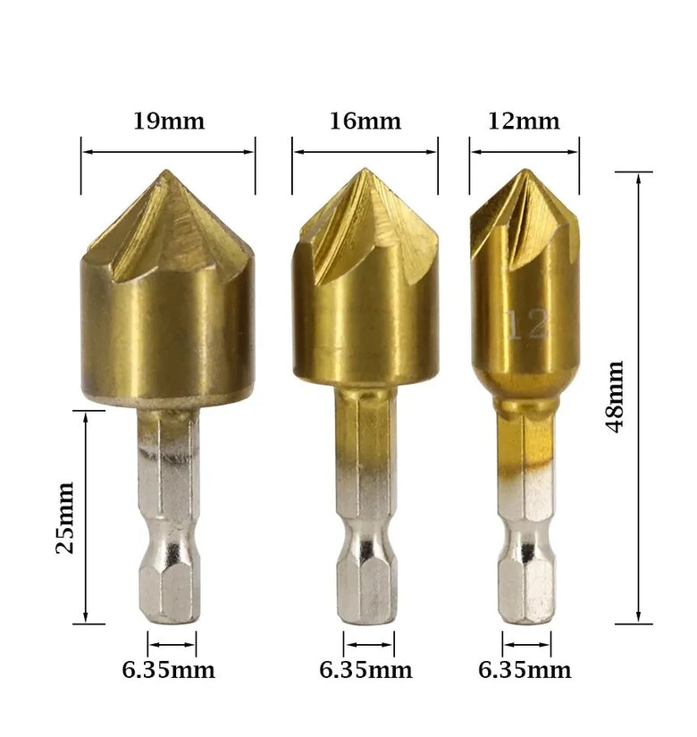 Five Flute Chamfer Debur Countersink 1/4' Hex.Ideal for chamfering, deburring and countersinking.Five flute design provides small chip loads and quicker removal.High speed steel construction.1/4' hex shank.90 Degree chamfer.Shank Size: 1/4 6.3mm hex shank.Tip Degrees: 90.Material:HSS.Item Type: Countersink.Flute:five fluteApplication Material:Wood,plastic,Aluminum plate etc.