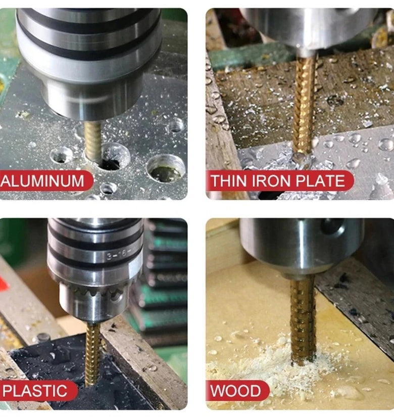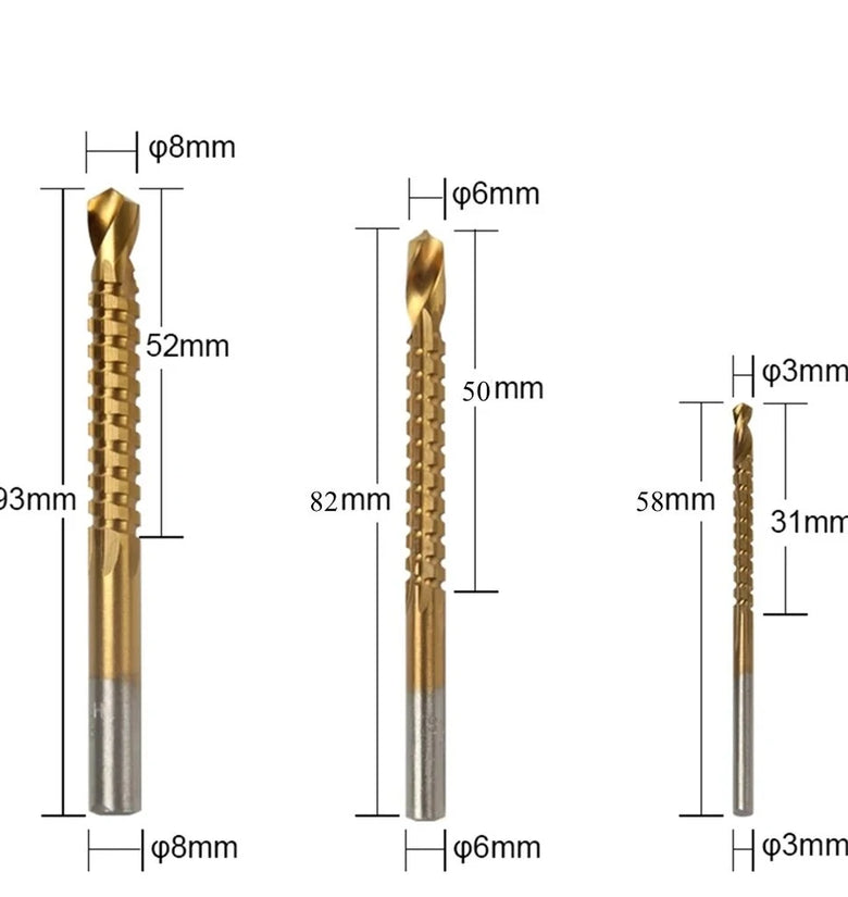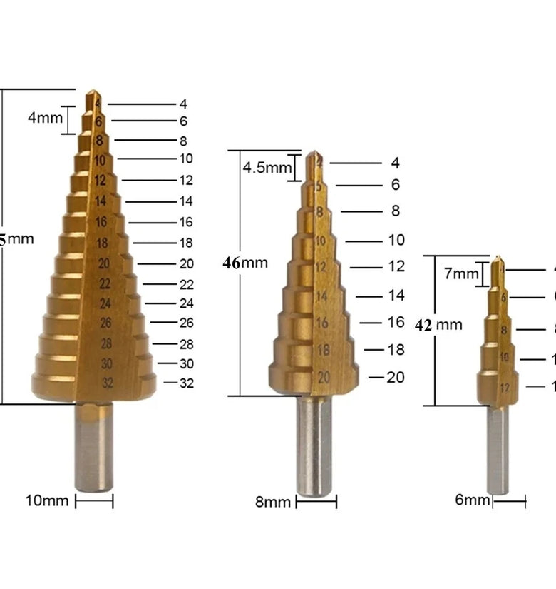 - Made of high speed steel material, stable and durable to use.- Titanium plating treatment.- Two Flute Design For Faster, Smoother Cutting.- The step drill bits Set replaces 29 individual drill bits.- High strength, hardness and easy to use.- Suitable for Drilling in Wood, Plastics, Steel, Aluminium and other Non Ferrous Metals.Specifications:Material: High Speed Steel Color: GoldSurface Treatment: Titanium PlatingStrp Drill Bits: 4-12mm / 4-20mm / 4-32mmSaw Drill Bits: 3mm / 6mm / 8mmInclude: 3pcs Strp Drill Bits & 3pcs Saw Drill Bits